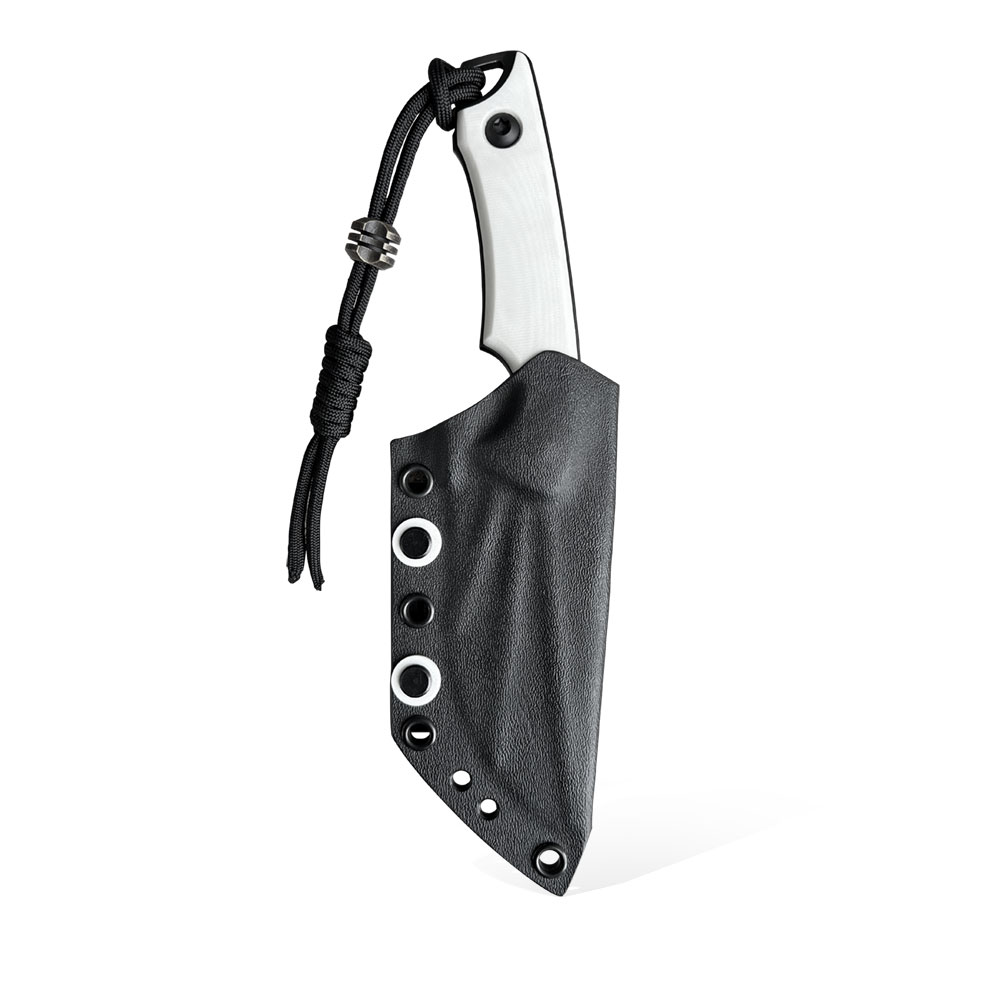 W zestawie z nożem otrzymujemy kaburę z ręcznie formowanego tworzywa Kydex. Kydex cechuje się wysoką odpornością na uderzenia, zarysowania, charakteryzuje się niską chłonnością wilgoci, odpornością na różnorodne warunki atmosferyczne oraz wiele środków chemicznych. Kabury z niego wykonane użytkujemy wygodnie i długotrwale. Dla ułatwienia w wyjmowaniu noża, zaprojektowana została podporę na kciuk, dzięki której nóż możemy wyjąć w sposób kontrolowany i bezpieczny. Kabura zaopatrzona została w piny przelotowe, do których można przypiąć np. uchwyt na krzesiwo (nie znajduje się w zestawie) lub użyć ich do jej zamocowania na plecaku. Kaburę do paska przypinamy za sprawą klamry T-Clip projektu Boba Terzuoli, wykonania CIVIVI, z którą to marką Torbé Knives współpracuje jako designer. T-Clip jest odpowiednikiem uchwytu Tek-Lok i jest kompatybilny z rozwiązaniami typu MOLLE. Zastosowanie klamry T-Clip jest zbieżne z koncepcją knifemekera o przenoszeniu noża w pełnej gotowości, na pasku bezpośrednio pod ręką.
