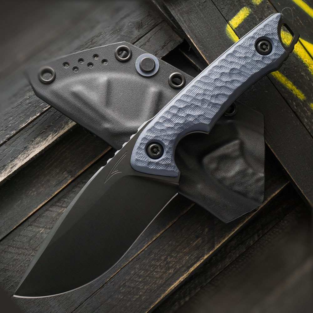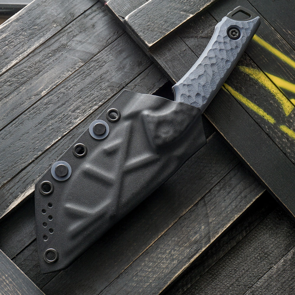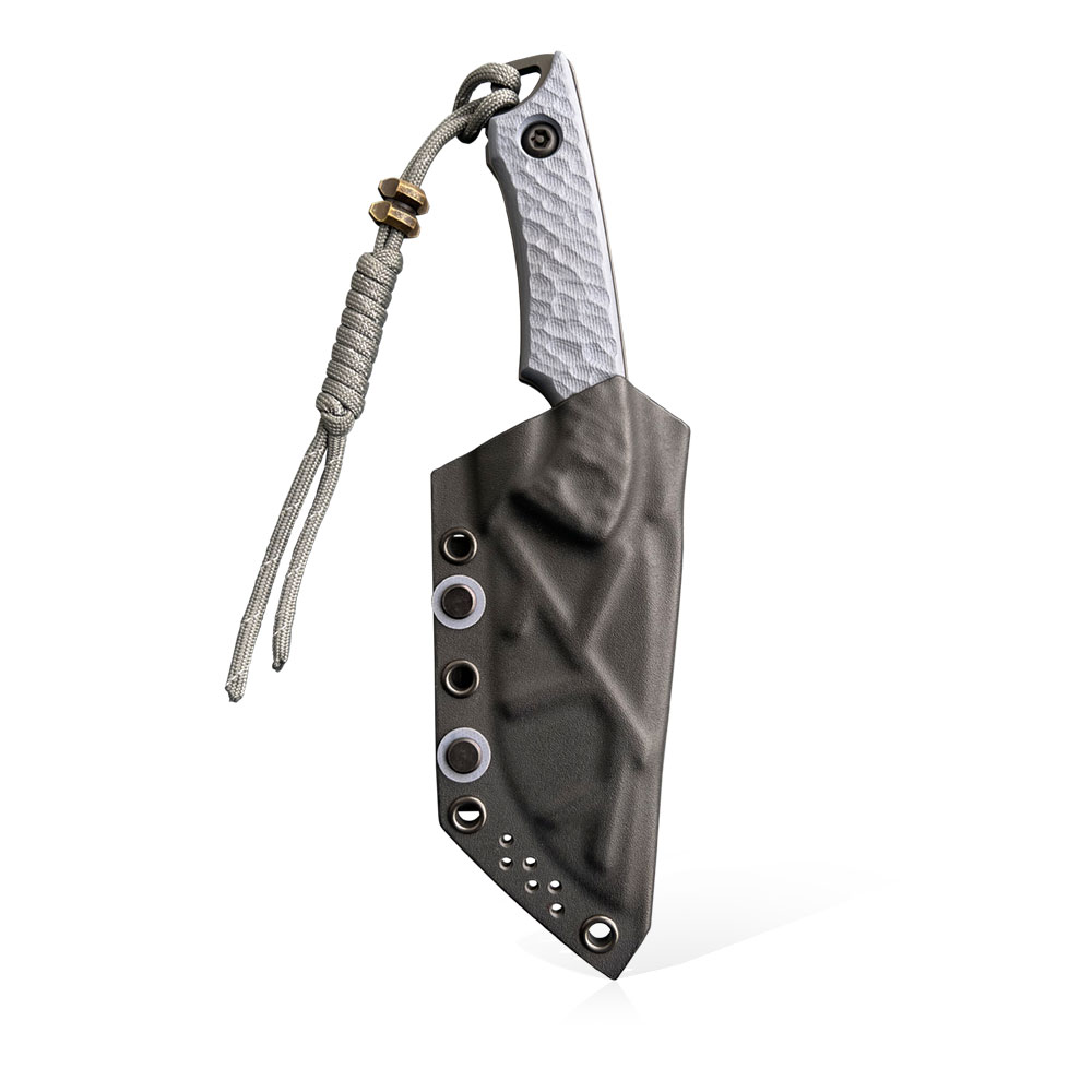 W zestawie z nożem otrzymujemy kaburę z ręcznie formowanego tworzywa Kydex. Kydex cechuje się wysoką odpornością na uderzenia, zarysowania, charakteryzuje się niską chłonnością wilgoci, odpornością na różnorodne warunki atmosferyczne oraz wiele środków chemicznych. Kabury z niego wykonane użytkujemy wygodnie i długotrwale. Dla ułatwienia w wyjmowaniu noża, zaprojektowana została podporę na kciuk, dzięki której nóż możemy wyjąć w sposób kontrolowany i bezpieczny. Kabura zaopatrzona została w piny przelotowe, do których można przypiąć np. uchwyt na krzesiwo (nie znajduje się w zestawie) lub użyć ich do jej zamocowania na plecaku. Kaburę do paska przypinamy za sprawą klamry T-Clip projektu Boba Terzuoli, wykonania CIVIVI, z którą to marką Torbé Knives współpracuje jako designer. T-Clip jest odpowiednikiem uchwytu Tek-Lok i jest kompatybilny z rozwiązaniami typu MOLLE. Zastosowanie klamry T-Clip jest zbieżne z koncepcją knifemekera o przenoszeniu noża w pełnej gotowości, na pasku bezpośrednio pod ręką.