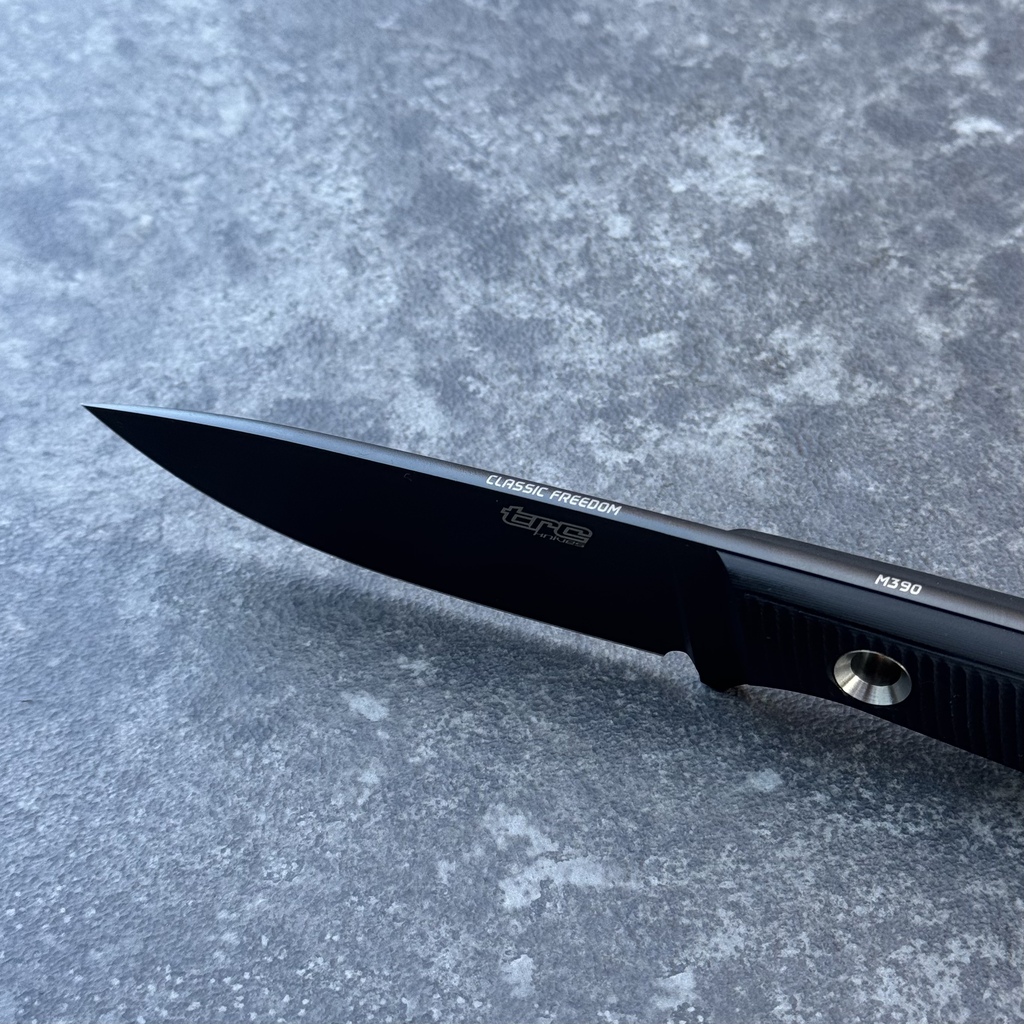 - ostrze o pełnym szlifie płaskim (FFG – Full Flat Grind), bez karbowania (jimpingu) na grzbiecie, w klasycznej czerni uzyskanej wysokiej klasy powłoką DLC ze świetnej stali M390,