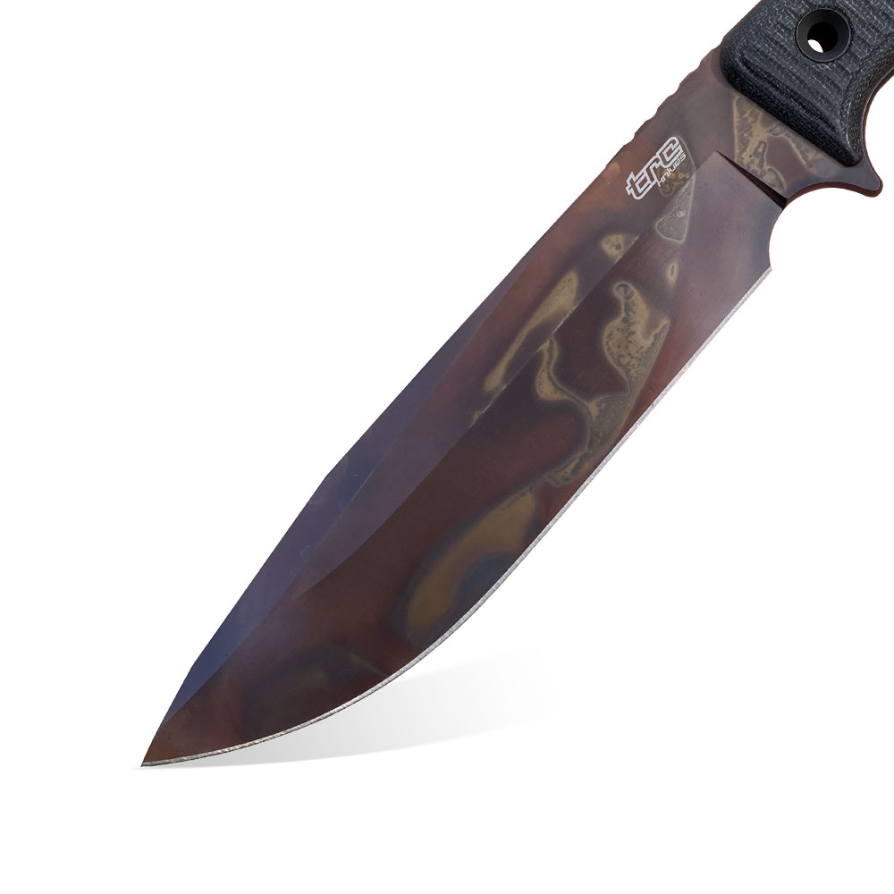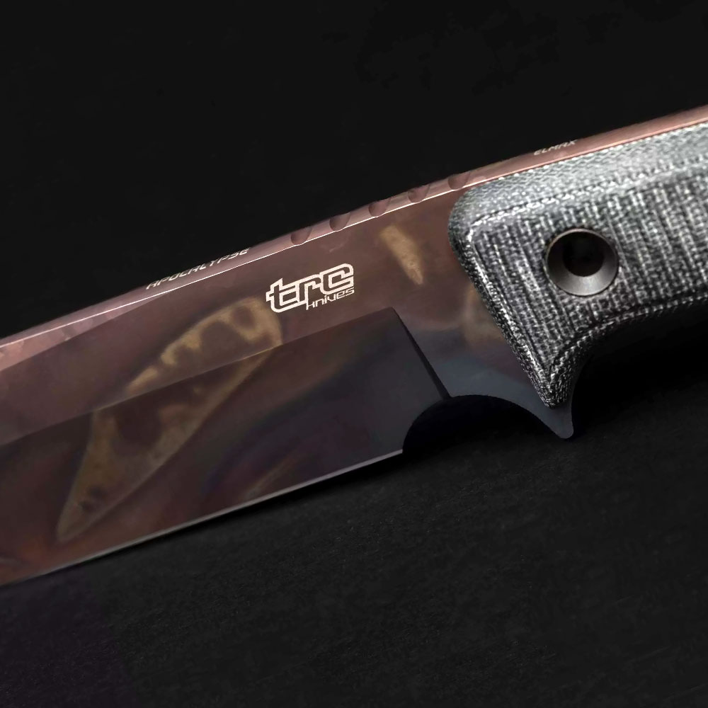 Nóż TRC Knives Apocalypse Apocalyptic Black Canvas Micarta z fantazyjnym rodzajem wykończenia ostrza, w którym litewska manufaktura się specjalizuje.