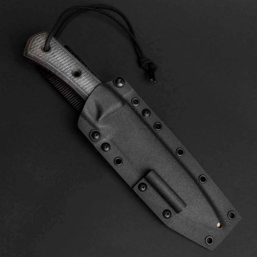 W zestawie z nożem otrzymujemy kaburę z ręcznie formowanego tworzywa Kydex, którą przytwierdzamy do paska za pomocą zrobionej z wytrzymałego nylonu o dużej gramaturze przelotki. Uchwyt z tego materiału daje elastyczność, która np. podczas przykucnięć czy schyleń układa się w sposób ograniczający czasami występujące uciążliwe ściśnięcia czy „przycięcia” ciała. Dla ułatwienia w wyjmowaniu noża, który bardzo dobrze opina ciasno dopasowane tworzywo zaplanowano podporę na kciuk, dzięki której nóż możemy wyjąć w sposób kontrolowany i bezpieczny. Sam Kydex to materiał bardzo wytrzymały, cechuje się wysoką odpornością na uderzenia, zarysowania, charakteryzuje się niską chłonnością wilgoci, odpornością na różnorodne warunki atmosferyczne oraz wiele środków chemicznych. Kabury z niego wykonane użytkujemy wygodnie i długotrwale. Kabura zaopatrzona została w piny przelotowe, do których można przypiąć np. uchwyt na krzesiwo (znajduje się w zestawie i jest oryginalnie podpięty) lub użyć ich do jej zamocowania na plecaku, elemencie uprzęży czy rozwiązaniu typu molle.