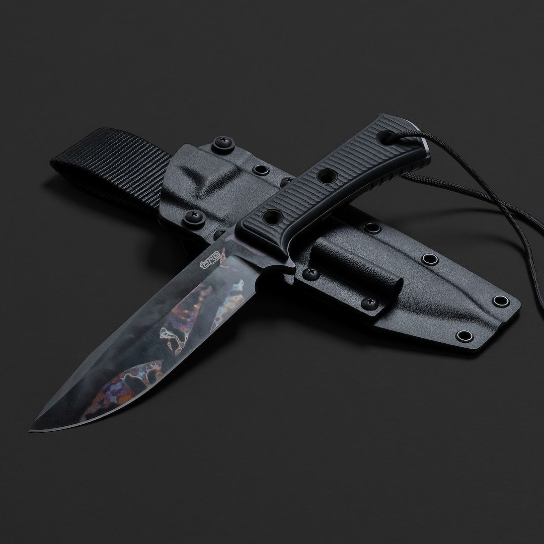 - Pokrowiec: czarna kabura Kydex (black Kydex) z uchwytem na krzesiwo