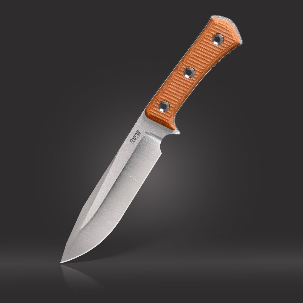 **DETALE KONSTRUKCJI**: Na głowni znajduje się karbowanie (jimping), które stanowi podporę dla kciuka podczas cięć wymagających dociśnięcia krawędzi tnącej do materiału. Wyprofilowany jelec zabezpiecza przed zsunięciem się dłoni na krawędź tnącą podczas pracy. Zaokrąglony grzbiet wystający z rękojeści poprawia komfort i pewność chwytu. Grzbiet jest minimalnie wypuszczony po za obrys z każdej strony rękojeści, a na linii głowicy (tylna część noża) jest go trochę więcej, co może służyć jako improwizować zgniatak czy podbijak.