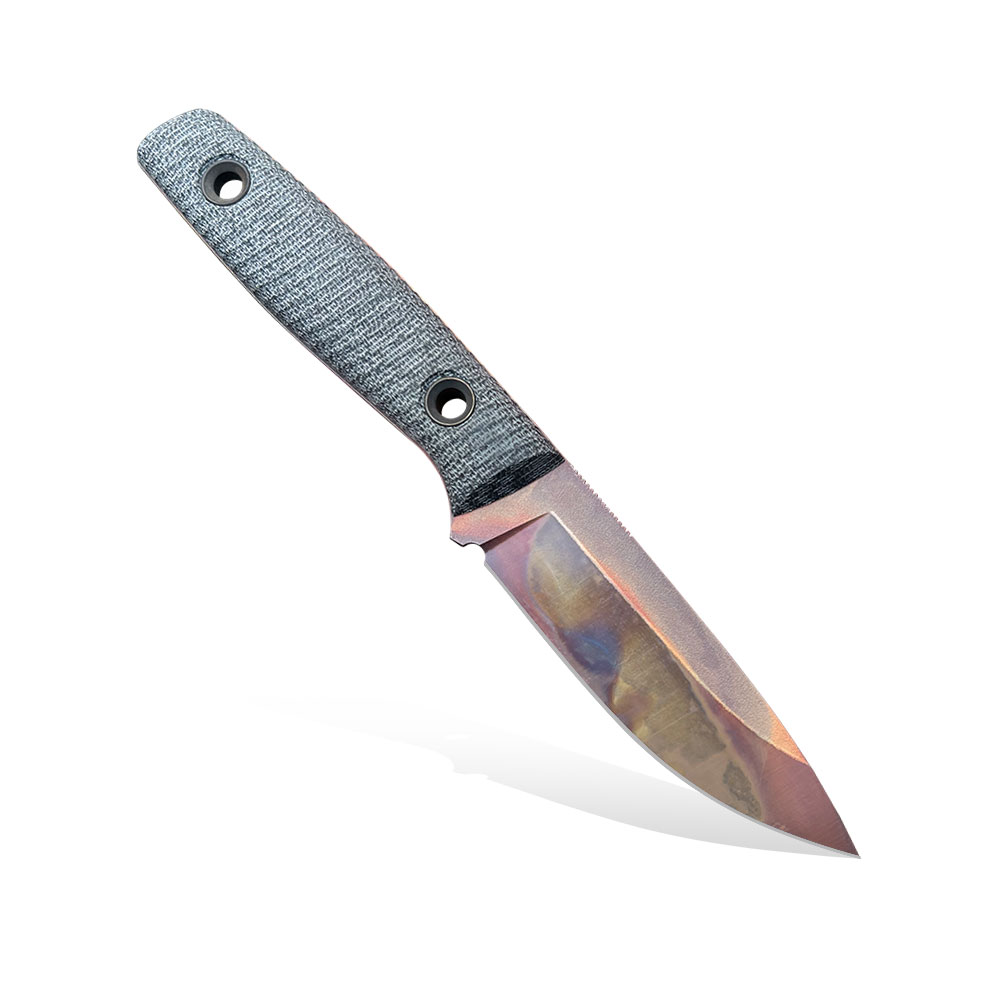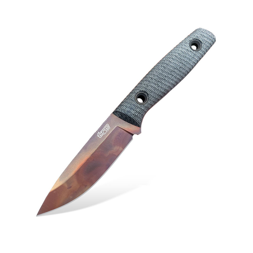 Uwagę w wykonaniu przykuwają okładziny rękojeści z czarnej micarty (Black Canvas Micarta), przytwierdzone stylowymi pinami przelotowymi, które to połączenie świetnie komponuje się z wykończeniem ostrza. Lustrując całość zauważamy plejadę różnych odcieni i barw, poczynając od jaśniejszej rękojeści, a kończąc na ciemniejszych odcieniach znajdujących się na ostrzu. Efekt ostateczny tego zestawienia to niepowtarzalny nóż, zarówno o walorach użytkowych jak i kolekcjonerskich. Nóż dostarczany jest w oryginalnym pudełku producenta wraz z czarną kaburą Kydex, naklejką TRC oraz certyfikatem.