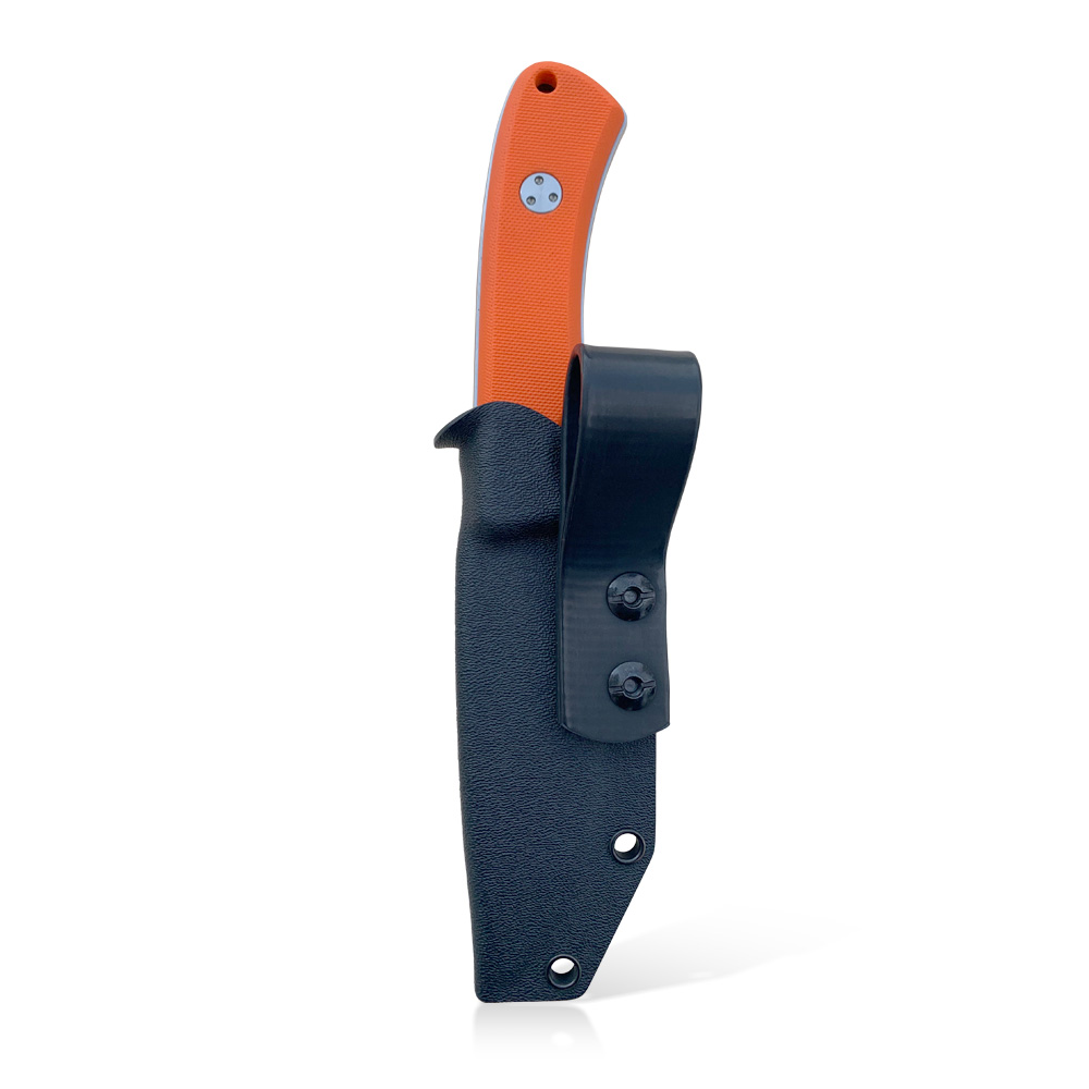 W zestawie z nożem otrzymujemy kaburę z ręcznie formowanego tworzywa Kydex w kolorze czarnym, którą przytwierdzamy do paska za pomocą grubej, gumowanej szlufki. Szlufka jest elastyczna, co powoduje że podczas przykucnięć czy schyleń układa się w sposób ograniczający czasami występujące uciążliwe ściśnięcia czy przycięcia ciała. Dla ułatwienia w wyjmowaniu noża, który bardzo dobrze opina ciasno dopasowane tworzywo zaplanowano podporę na kciuk, dzięki której nóż możemy wyjąć w sposób kontrolowany i bezpieczny. Sam Kydex cechuje się wysoką odpornością na uderzenia, zarysowania, charakteryzuje się niską chłonnością wilgoci, odpornością na różnorodne warunki atmosferyczne oraz wiele środków chemicznych. Kabury z niego wykonane użytkujemy wygodnie i długotrwale. Kabura zaopatrzona została w piny przelotowe, do których można przypiąć np. uchwyt na krzesiwo (nie znajduje się w zestawie) lub użyć ich do jej zamocowania na plecaku, elemencie uprzęży czy rozwiązaniu typu MOLLE.