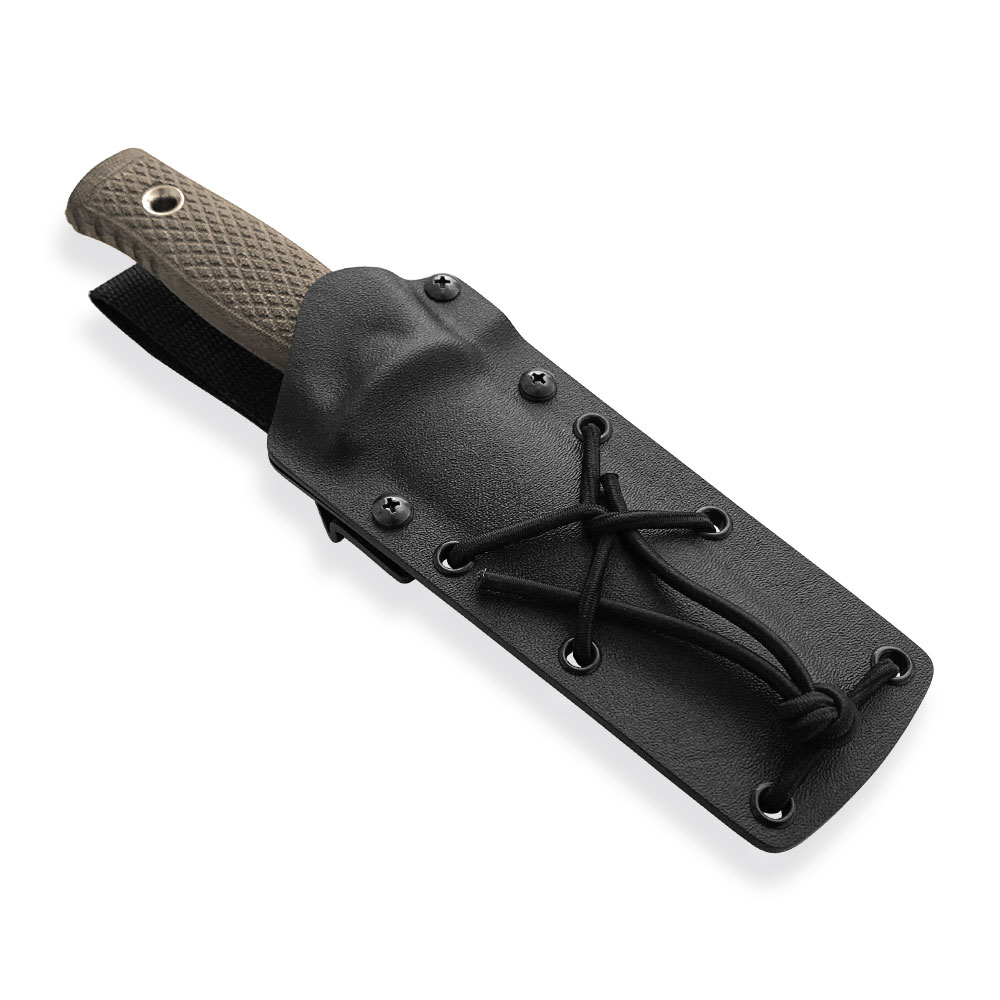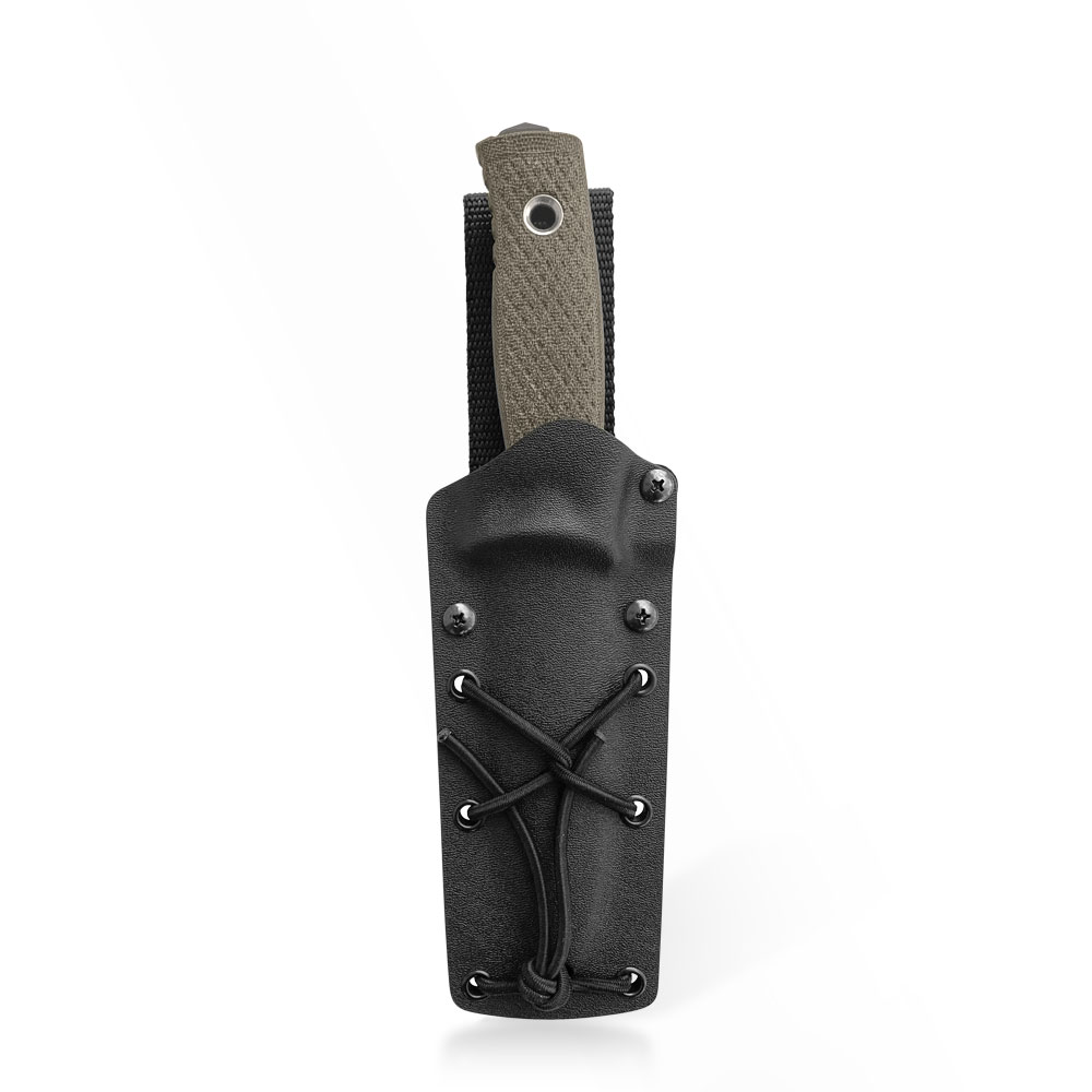 Nóż posiada kaburę z ręcznie formowanego tworzywa Kydex cechującego się wysoką odpornością na uderzenia, zarysowania, charakteryzującego się niską chłonnością wilgoci, odpornego na różnorodne warunki atmosferyczne oraz wiele środków chemicznych. Dla ułatwienia w wyjmowaniu noża, który bardzo dobrze opina ciasno dopasowane tworzywo zaplanowano podporę na kciuk, dzięki której nóż możemy wyjąć w sposób kontrolowany i bezpieczny. Kaburę możemy przymocować do pasa – za pomocą zrobionej z wytrzymałego nylonu o dużej gramaturze przelotki. Kabura posiada sznurek służący do alternatywnych form przenoszenia na częściach uprzęży, plecach, częściach systemu MOLLE itd. Sznurek rozciąga się jak guma i nie traci swojej elastyczności (nie uszkadza się, nie pęka) nawet w ekstremalnych (ujemnych i dodatnich) warunkach pogodowych.