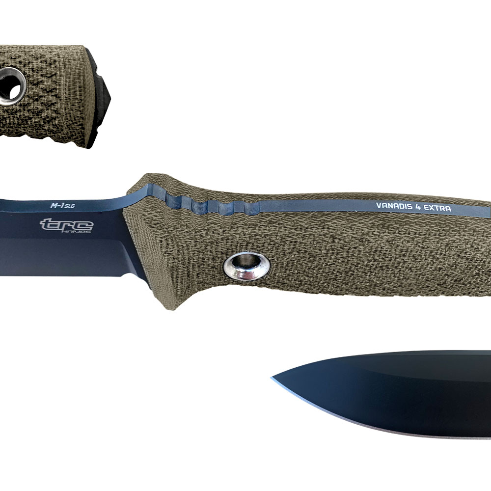 Nóż TRC Knives M-1SLG wyróżnia posiadające świetną wytrzymałość ostrze ze stali Vanadis 4 Extra w czarnej powłoce DLC. Rękojeść wykonano ze specjalnej odmiany naturalnej micarty (Natural Canvas Micarta) a do przenoszenia służy kabura z czarnego tworzywa Kydex. Na zakończeniu rękojeści noża znajduje się wybijak do szyb.
