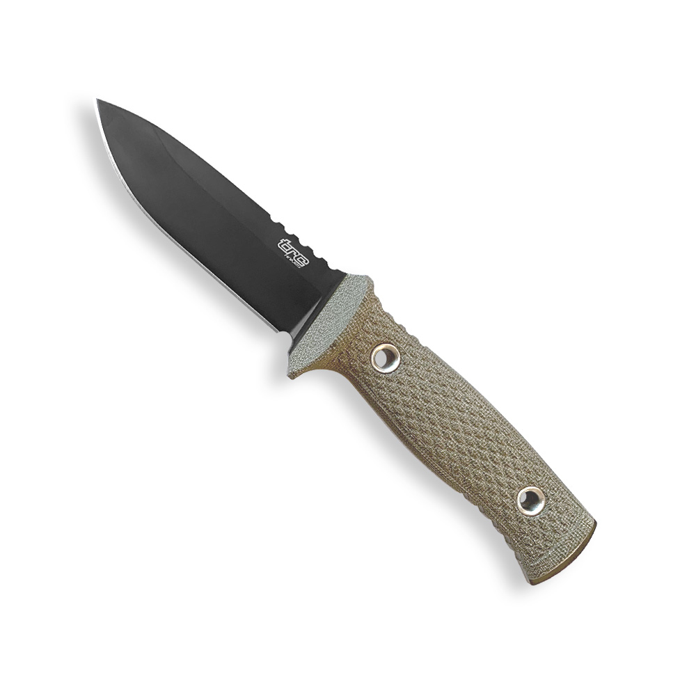 Okładziny rękojeści o ergonomicznym, zowalizowanym kształcie wykonane zostały z zielonego, wręcz „zachęcającego” do używania w terenie laminatu Green Canvas Micarta odpornego na wilgoć, zmiany temperatury, większość rozpuszczalników i kwasów, posiadającego wysoką odporność na uszkodzenia mechaniczne. Micarta znana ze swoich doskonałych właściwości, również wizualnych (daje się stylizować na naturalny materiał) ma antypoślizgową, chropowatą strukturę. W okładzinach znajdziemy dodatkowo przelotowe piny, które z jednej strony służą do ich mocowania (oprócz klejenia) a z drugiej wykorzystywane są na zamocowanie dodatkowej linki, która może służyć jako zabezpieczenie przed upuszczeniem noża podczas pracy, lub dodatkowy chwytak ułatwiający wyjmowanie noża z kabury.