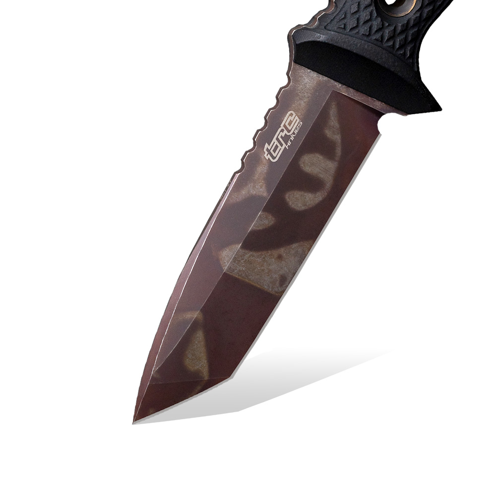 **MATERIAŁ RĘKOJEŚCI**: Okładziny rękojeści wykonane zostały z kompozytu G10 odpornego na wilgoć, zmiany temperatury, większość rozpuszczalników i kwasów, posiadającego wysoką odporność na uszkodzenia mechaniczne. G10 ma antypoślizgową, chropowatą strukturę. Okładki mocowane są na klej i przelotowe piny (tuby), wykorzystywane na zamocowanie np. linki zabezpieczającej przed upuszczeniem noża podczas pracy, lub chwytak ułatwiający wyjmowanie noża z kabury.