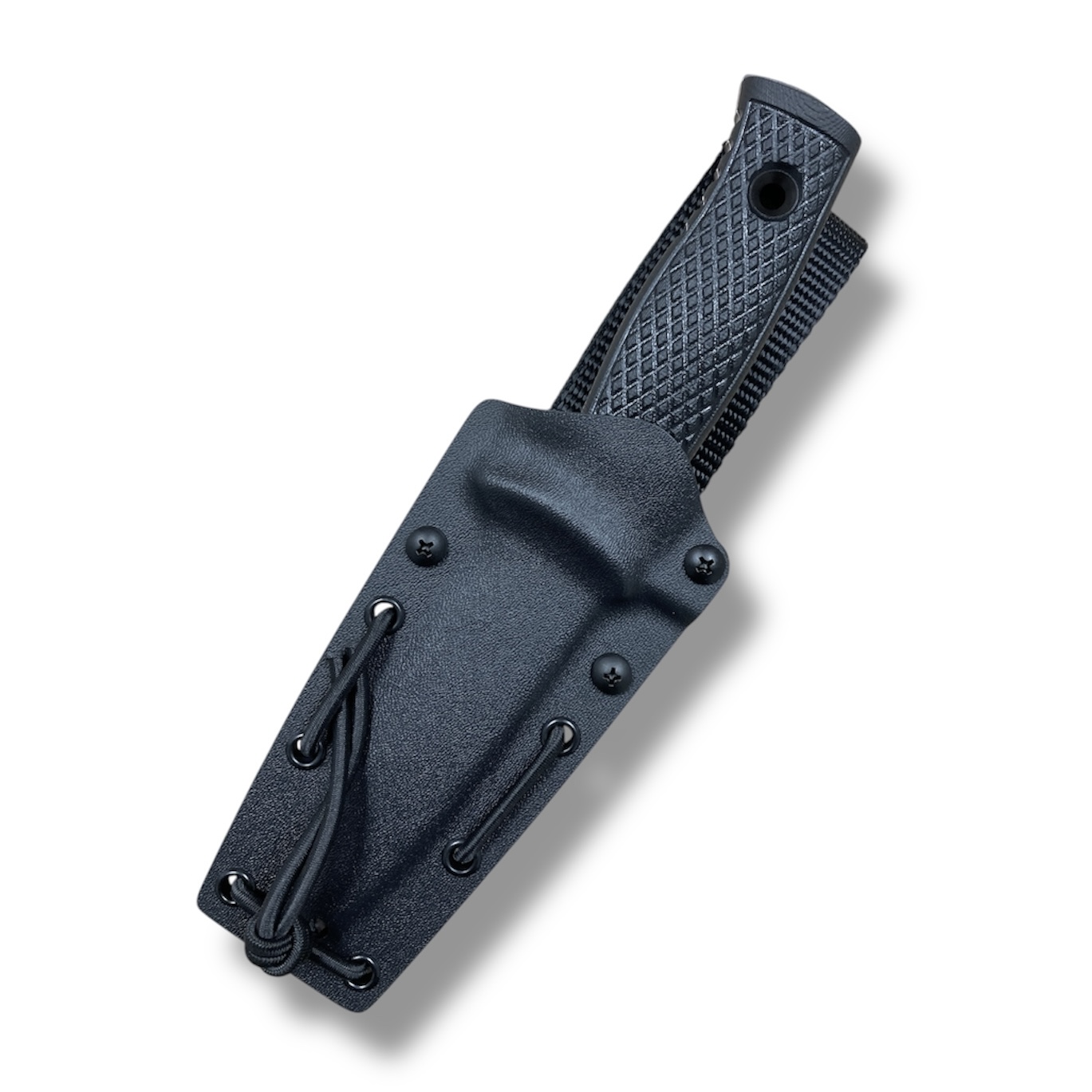 Kydex jest materiałem bardzo wytrzymałym, cechuje się wysoką odpornością na uderzenia, zarysowania, charakteryzuje się niską chłonnością wilgoci, odpornością na różnorodne warunki atmosferyczne oraz wiele środków chemicznych. Kabury z niego wykonane użytkujemy wygodnie i długotrwale. Kabura zaopatrzona została w piny przelotowe, do których można przypiąć np. uchwyt na krzesiwo (nie znajduje się w zestawie) lub użyć ich do jej zamocowania na plecaku, elemencie uprzęży czy rozwiązaniu typu molle.
