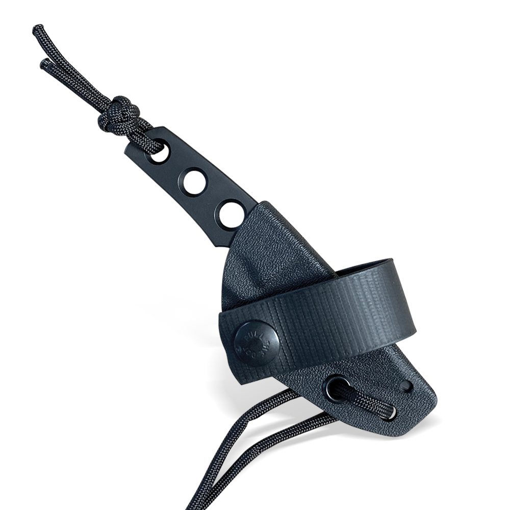 W zestawie z nożem otrzymujemy kaburę z ręcznie formowanego tworzywa Kydex w kolorze czarnym. Kabura ma możliwość mocowania do paska za sprawą załączonej przelotki, aby nóż czekał w pełnej gotowości bezpośrednio na wysokości opuszczonej ręki. Załączona linka pozwala na alternatywne przenoszenie noża na szyi (jako nóż typu neck), kiedy chcemy żeby nóż był jeszcze bardziej dostępny i od razu gotowy do działania. W przypadku tego sposobu noszenia należy pamiętać o dodatkowym zabezpieczeniu noża np. paracordem czy sznurkiem, aby uniknąć wypadnięcia noża z kabury.