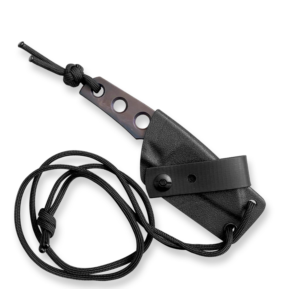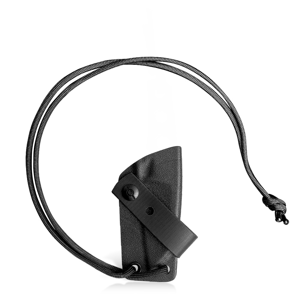 W zestawie z nożem otrzymujemy kaburę z ręcznie formowanego tworzywa Kydex® w kolorze czarnym. Kabura ma możliwość mocowania przy pasku za sprawą załączonej przelotki, aby nóż czekał w pełnej gotowości bezpośrednio na wysokości opuszczonej ręki. Załączona linka pozwala na alternatywne przenoszenie noża na szyi (jako nóż typu neck), kiedy chcemy żeby nóż był jeszcze bardziej dostępny i od razu gotowy do działania. Sam Kydex® cechuje się wysoką odpornością na uderzenia, zarysowania, charakteryzuje się niską chłonnością wilgoci, odpornością na różnorodne warunki atmosferyczne oraz wiele środków chemicznych. Kabury z niego wykonane użytkujemy wygodnie i długotrwale.NAZWA: Mini Wharncliffe