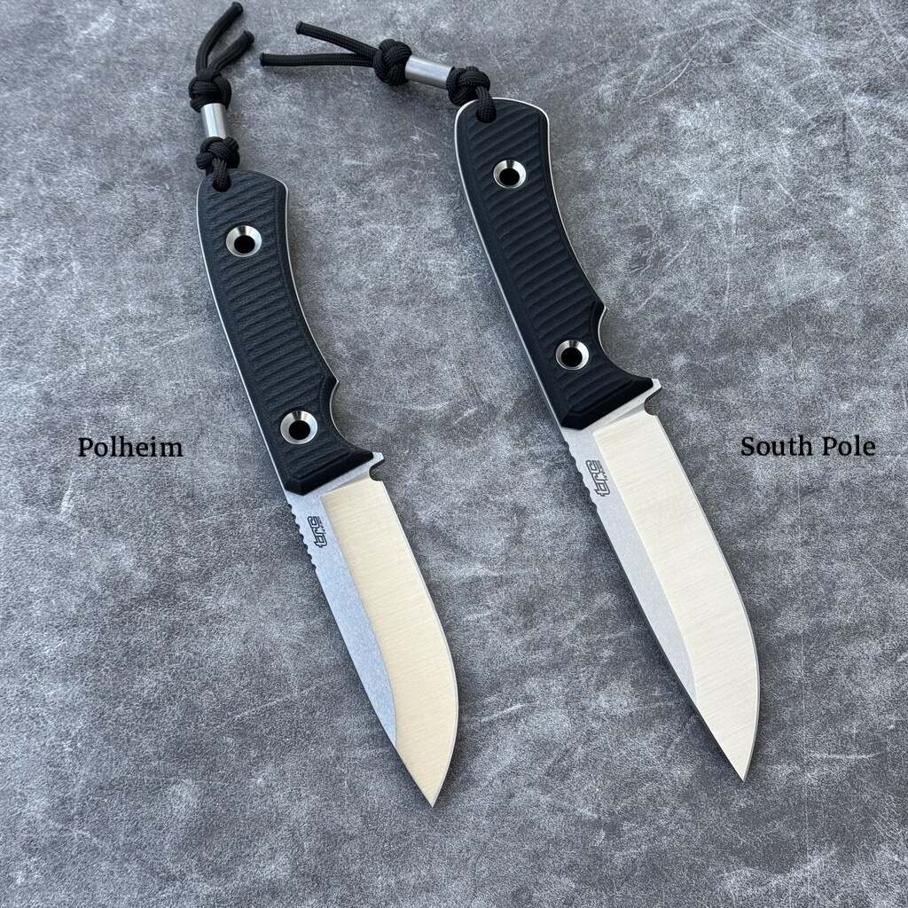 **Polheim to ewolucja produkowanego wcześniej noża K-1s, świetnego uniwersalnego ostrza z oferty TRC Knives. Polheim w porównaniu do K-1s oferuje minimalnie cieńszą klingę oraz wyżej wyprowadzony szlif, co poprawia wydajność cięcia. Subtelne odchudzenie ostrza (z 3,8 mm | 0.15″ grzbietu na 3,5 mm | 0.12″), przy zastosowaniu znanej ze swojej wytrzymałości nowoczesnej stali MagnaCut dało świetne efekty użytkowe. Powiększenie podcięcia w ostrzu (choil) ma za zadanie jeszcze bardziej ułatwić ostrzenie a karbowanie na grzbiecie (jimping) w nowej stylistyce nawiązuje do najlepszych cech noża South Pole. Zmiany dotknęły również rękojeść. Okładziny rękojeści zyskały nową teksturę, nie mniej chwytną niż starsza, występująca w K-1s, ale podkreślającą odrębność nowego modelu.