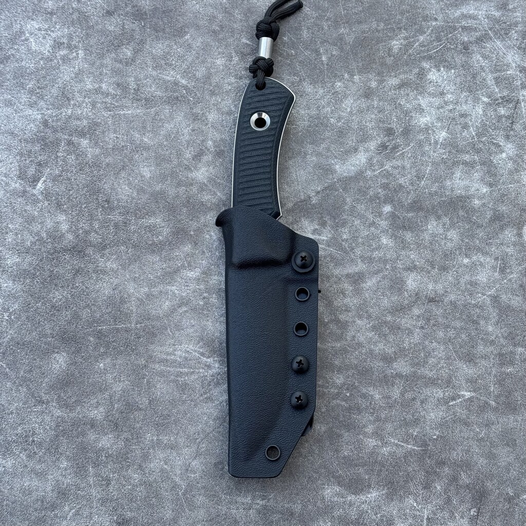 W zestawie z nożem otrzymujemy kaburę z ręcznie formowanego tworzywa kydex w kolorze czarnym, którą przytwierdzamy do paska za pomocą amerykańskiej klamry UlliClip. Klips pozwala na montaż całości na pasku lub na krawędzi kieszeni wewnątrz lub na zewnątrz.