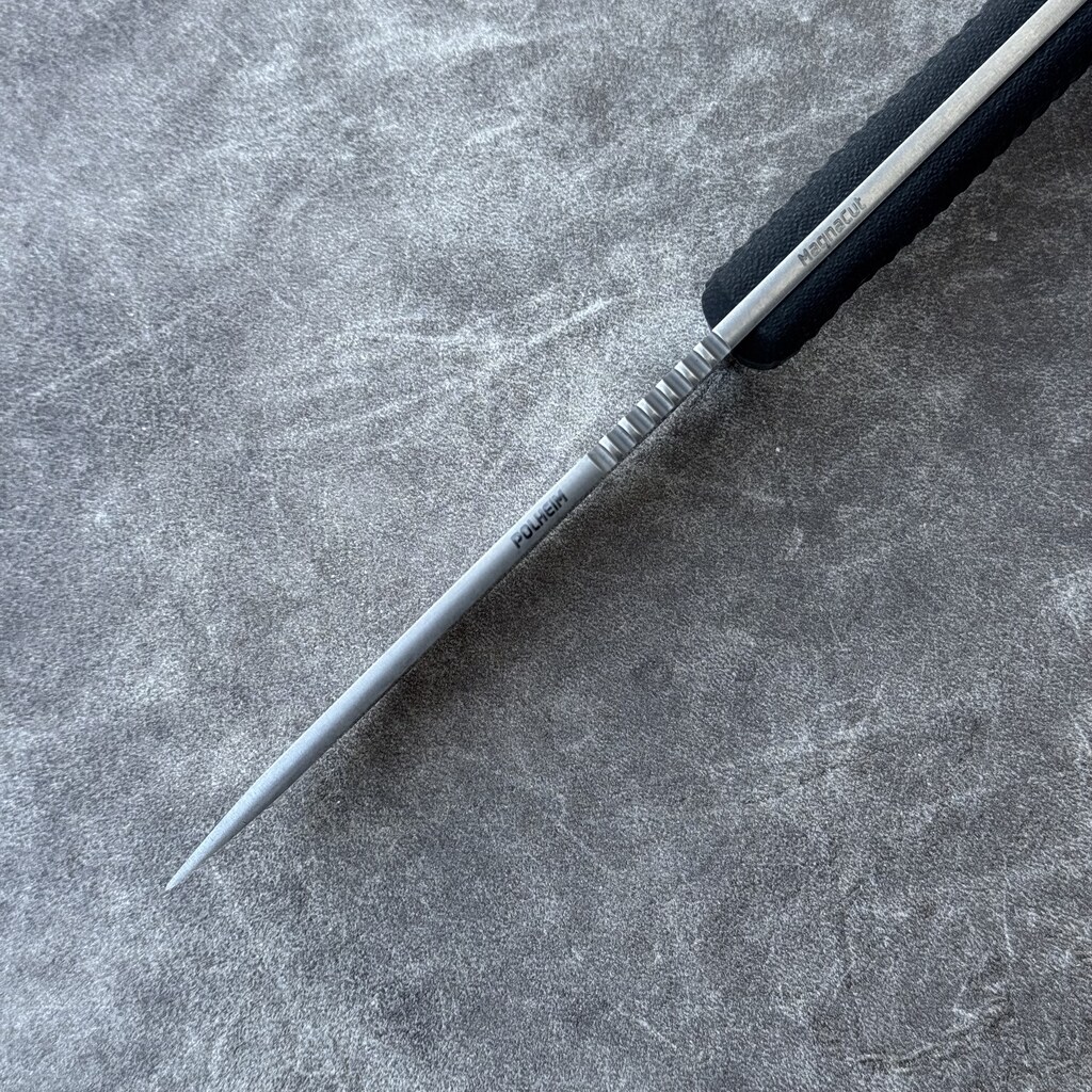 ***Prezentowany Polheim zyskał okładki z nowego materiału znanego jako Double Black Canvas Micarta, znacznie ciemniejszego niż standardowa czarna micarta (Black Canvas Micarta). Okładki przymocowano nowym rodzajem tub ze stali nierdzewnej, współgrającymi z zaplecionym na nożu koralikiem z tego samego materiału. Zmiany dotknęły również kydexowej kabury. Co prawda zastosowano znaną z wcześniejszych wykonań stylistykę i jak zawsze wytrzymały kydex’owy materiał, natomiast zaopatrzono go w klips amerykańskiej matki Ulti-Clip dla łatwego i wygodniejszego sposobu przenoszenia.