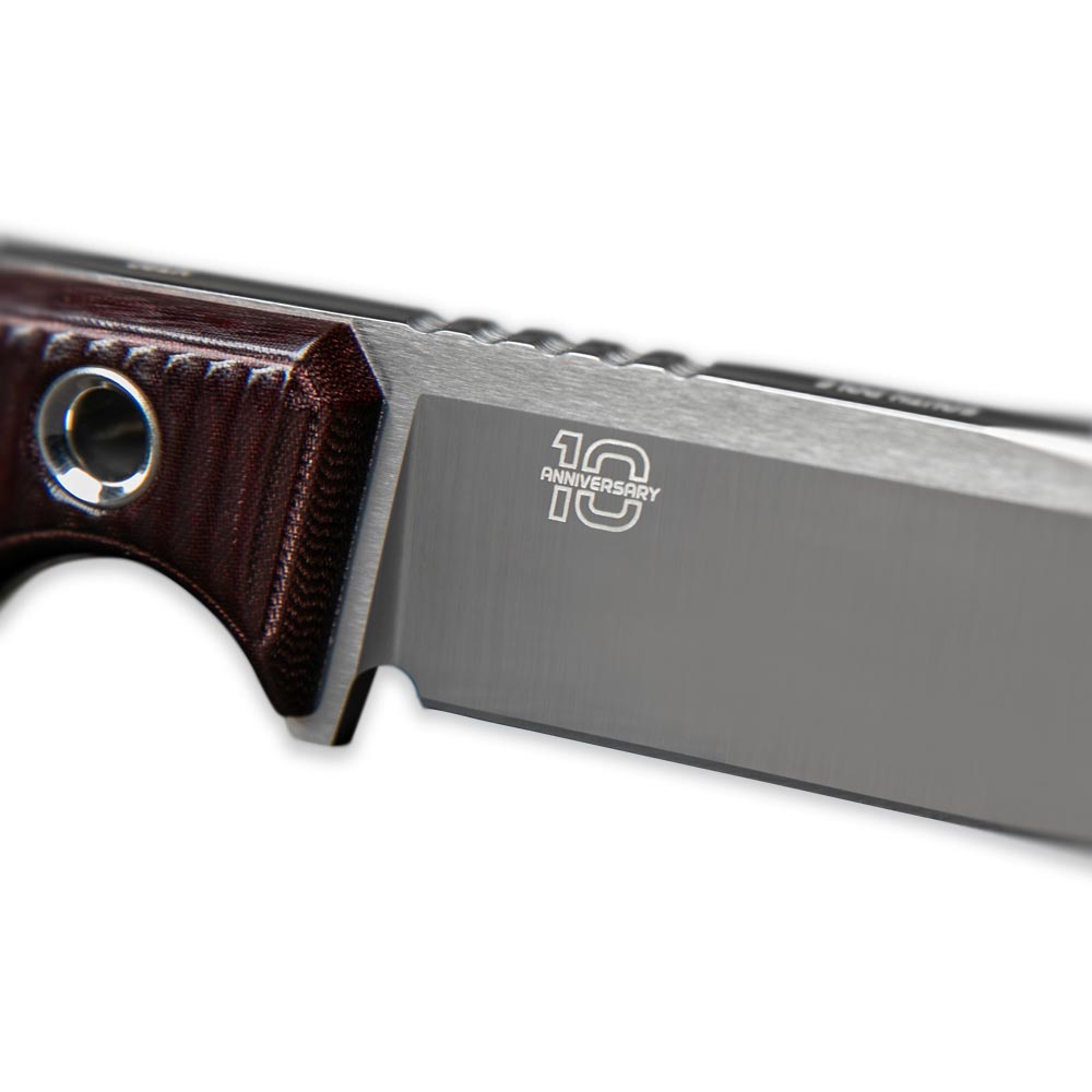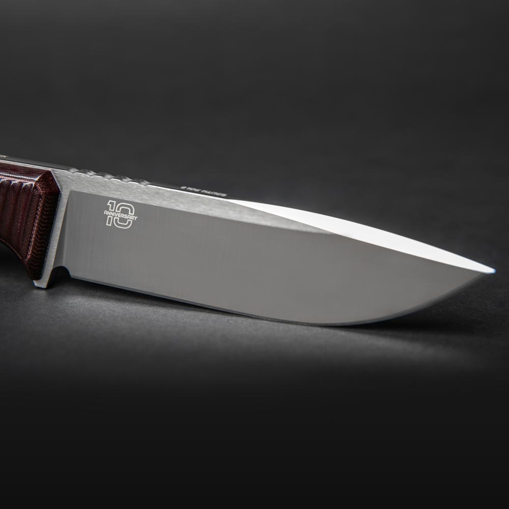 South Pole 10th Anniversary Editions to nóż o konstrukcji full tang (z jednego starannie wyselekcjonowanego kawałka materiału) z najwyższej jakości stali M390. Jest to jedna z kilku stali dostępnych na rynku znajdujących się w absolutnym topie jakościowym materiałów służących do produkcji noży premium. Najlepsze jej właściwości uzyskuje się poprzez właściwe wykonanie procesu hartowania, w którym bezbłędnie muszą być przeprowadzone 3 etapy: utwardzanie, chłodzenie kriogeniczne (wymrażanie) i odpuszczanie (więcej o procesie wytwórczym TRC Knives znajdziesz w rozmowie z Andriusem Triciusem, którą możesz przeczytać tutaj). Właściwie przygotowane ostrze z M390 jest ekstremalnie wytrzymałe na przeciążenia, niezwykle długo pozostaje ostre (bardzo wolno się ściera) i ma doskonałe właściwości antykorozyjne.