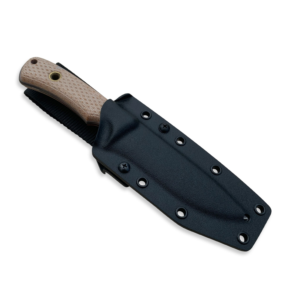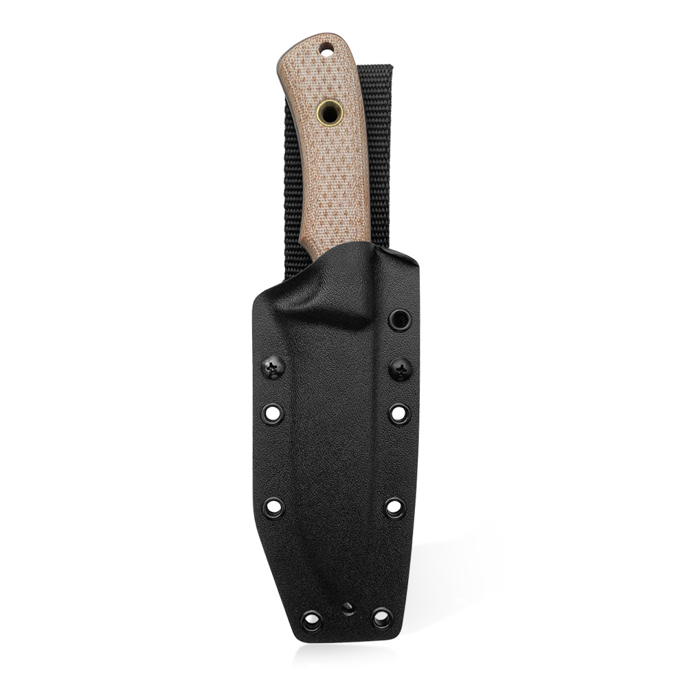 W zestawie z nożem otrzymujemy kaburę z ręcznie formowanego tworzywa Kydex® w kolorze czarnym, którą przytwierdzamy do paska za pomocą zrobionej z wytrzymałego nylonu o dużej gramaturze przelotki. Uchwyt z tego materiału daje elastyczność, która np. podczas przykucnięć czy schyleń układa się w sposób ograniczający czasami występujące uciążliwe ściśnięcia czy przycięcia ciała. Dla ułatwienia w wyjmowaniu noża, który bardzo dobrze opina ciasno dopasowane tworzywo zaplanowano podporę na kciuk, dzięki której nóż możemy wyjąć w sposób kontrolowany i bezpieczny. Sam Kydex® cechuje się wysoką odpornością na uderzenia, zarysowania, charakteryzuje się niską chłonnością wilgoci, odpornością na różnorodne warunki atmosferyczne oraz wiele środków chemicznych. Kabury z niego wykonane użytkujemy wygodnie i długotrwale. Kabura zaopatrzona została w piny przelotowe, do których można przypiąć np. uchwyt na krzesiwo (nie znajduje się w zestawie) lub użyć ich do jej zamocowania na plecaku, elemencie uprzęży czy rozwiązaniu typu Molle®.