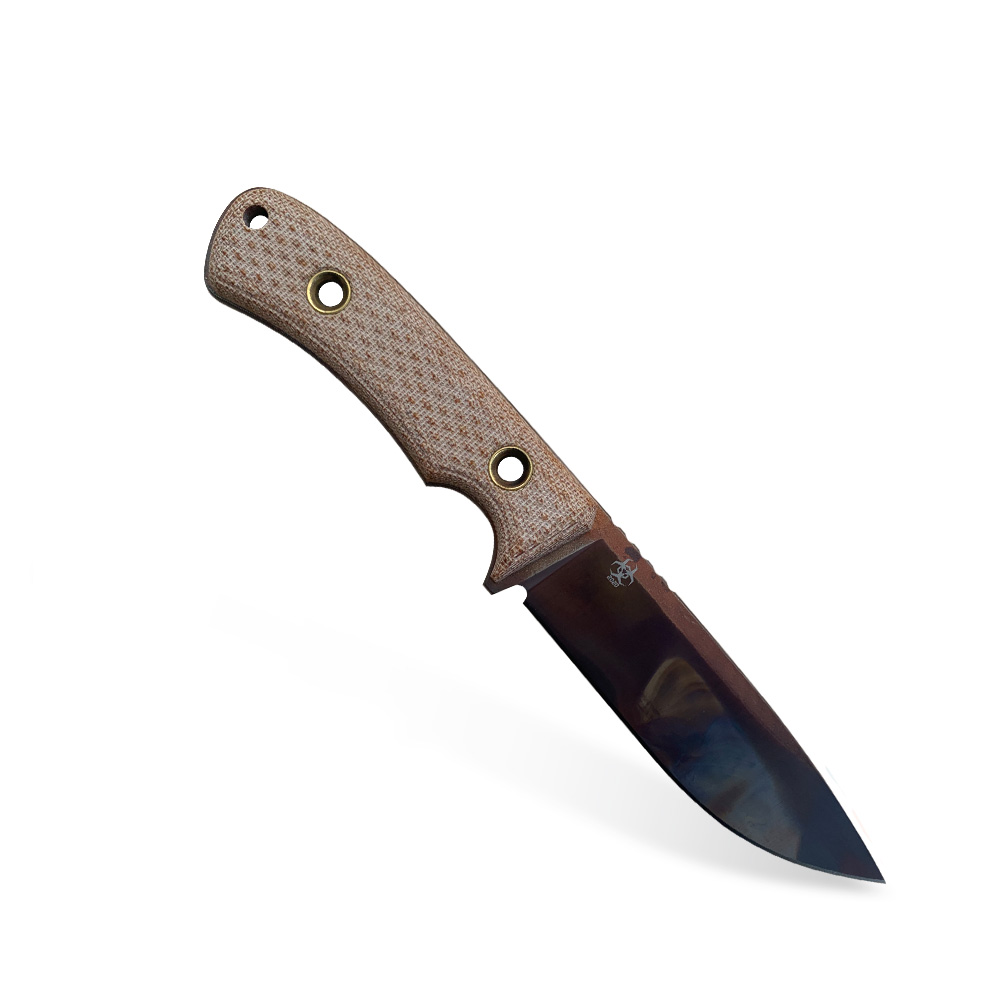 Okładziny rękojeści o ergonomicznym, zowalizowanym kształcie wykonane zostały z brązowego laminatu Canvas Micarta® (Natural Canvas Micarta®) odpornego na wilgoć, zmiany temperatury, większość rozpuszczalników i kwasów, posiadającego wysoką odporność na uszkodzenia mechaniczne. Micarta® znana ze swoich doskonałych właściwości, również wizualnych (daje się stylizować na naturalny materiał) ma antypoślizgową, chropowatą strukturę. Same okładziny zostały przyklejone i zamontowane mosiężnymi tubami spójnymi z ogólnym designem noża. Całość przemyślanej konstrukcji sprawia, że rękojeść bardzo dobrze dopasowuje się do dłoni a chwyt jest mocny i pewny. Na zakończeniu rękojeści zaprojektowano otwór na na zamocowanie dodatkowej linki, która może służyć jako zabezpieczenie przed upuszczeniem noża podczas pracy. Oryginalnie do otworu została przypięta ozdoba w postaci mosiężnego koralika (koralik widoczny na głównym zdjęciu produktu).
