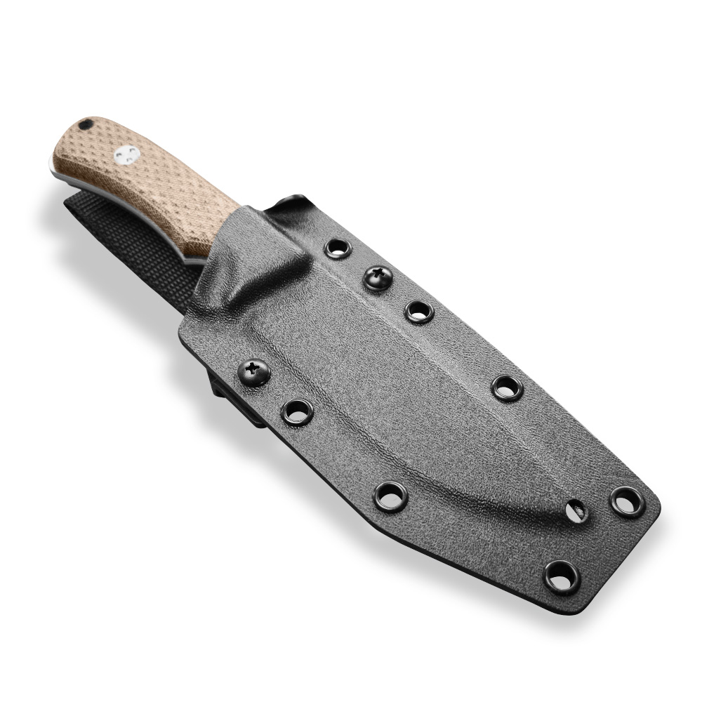 W zestawie z nożem otrzymujemy kaburę z ręcznie formowanego tworzywa kydex w kolorze czarnym, którą przytwierdzamy do paska za pomocą zrobionej z wytrzymałego nylonu o dużej gramaturze przelotki. Uchwyt z tego materiału daje elastyczność, która np. podczas przykucnięć czy schyleń układa się w sposób ograniczający czasami występujące uciążliwe ściśnięcia czy przycięcia ciała. Dla ułatwienia w wyjmowaniu noża, który bardzo dobrze opina ciasno dopasowane tworzywo zaplanowano podporę na kciuk, dzięki której nóż możemy wyjąć w sposób kontrolowany i bezpieczny. Sam kydex cechuje się wysoką odpornością na uderzenia, zarysowania, charakteryzuje się niską chłonnością wilgoci, odpornością na różnorodne warunki atmosferyczne oraz wiele środków chemicznych. Kabury z niego wykonane użytkujemy wygodnie i długotrwale. Kabura zaopatrzona została w piny przelotowe, do których można przypiąć np. uchwyt na krzesiwo (nie znajduje się w zestawie) lub użyć ich do jej zamocowania na plecaku, elemencie uprzęży czy rozwiązaniu typu Molle.