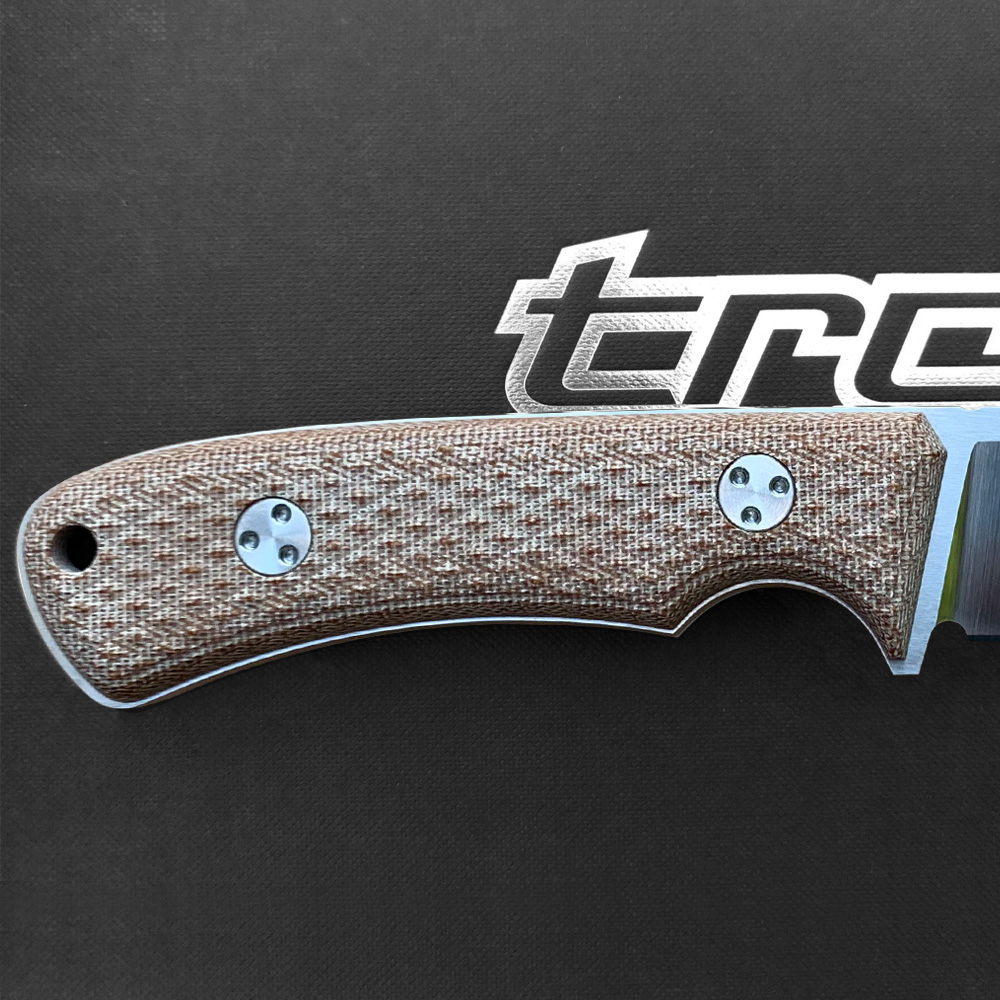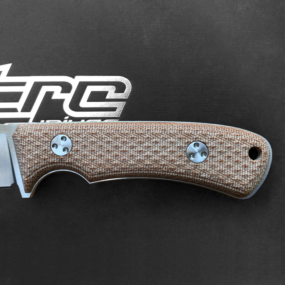 Okładziny rękojeści o ergonomicznym, zowalizowanym kształcie wykonane zostały z brązowego laminatu Canvas Micarta odpornego na wilgoć, zmiany temperatury, większość rozpuszczalników i kwasów, posiadającego wysoką odporność na uszkodzenia mechaniczne. Micarta znana ze swoich doskonałych właściwości, również wizualnych (daje się stylizować na naturalny materiał) ma antypoślizgową, chropowatą strukturę. Same okładziny zostały przyklejone i przykręcone ozdobnymi nierdzewnymi śrubami wyglądem spójnymi z ogólnym designem noża. Śruby są zamontowane na stałe, nie należy ich odkręcać samodzielnie aby nie utracić gwarancji. Całość przemyślanej konstrukcji sprawia, że rękojeść bardzo dobrze dopasowuje się do dłoni a chwyt jest mocny i pewny. Na zakończeniu rękojeści zaprojektowano otwór na na zamocowanie dodatkowej linki, która może służyć jako zabezpieczenie przed upuszczeniem noża podczas pracy, lub dodatkowy chwytak ułatwiający wyjmowanie noża z kabury.