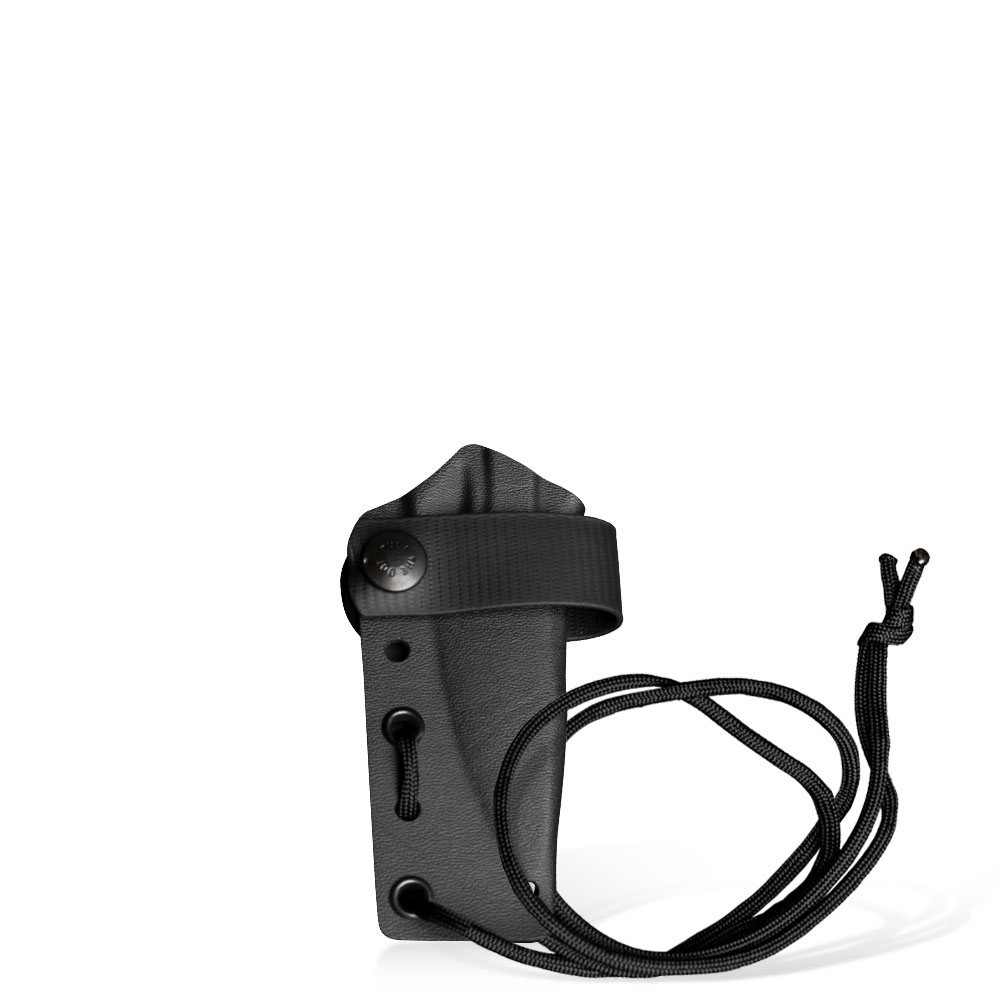 W zestawie z nożem otrzymujemy kaburę z ręcznie formowanego tworzywa Kydex w kolorze czarnym, którą przytwierdzamy do paska za pomocą  przelotki. Taki sposób przenoszenia sprawia, że nóż czeka w pełnej gotowości bezpośrednio na wysokości opuszczonej ręki. Dla ułatwienia w wyjmowaniu noża, który bardzo dobrze opina ciasno dopasowane tworzywo zaplanowano podporę na kciuk, dzięki której nóż możemy wyjąć w sposób kontrolowany i bezpieczny. Sam Kydex cechuje się wysoką odpornością na uderzenia, zarysowania, charakteryzuje się niską chłonnością wilgoci, odpornością na różnorodne warunki atmosferyczne oraz wiele środków chemicznych. Kabury z niego wykonane użytkujemy wygodnie i długotrwale. Kabura zaopatrzona została w piny przelotowe, do których oryginalnie dołączony jest sporej długości odcinek paracordu, aby nóż można było swobodnie zawiesić na szyję (jako nóż typu neck). Ten sposób mocowania rekomendujemy w sytuacjach, kiedy chcemy aby nóż był maksymalnie dostępny i szybko gotowy do działania.