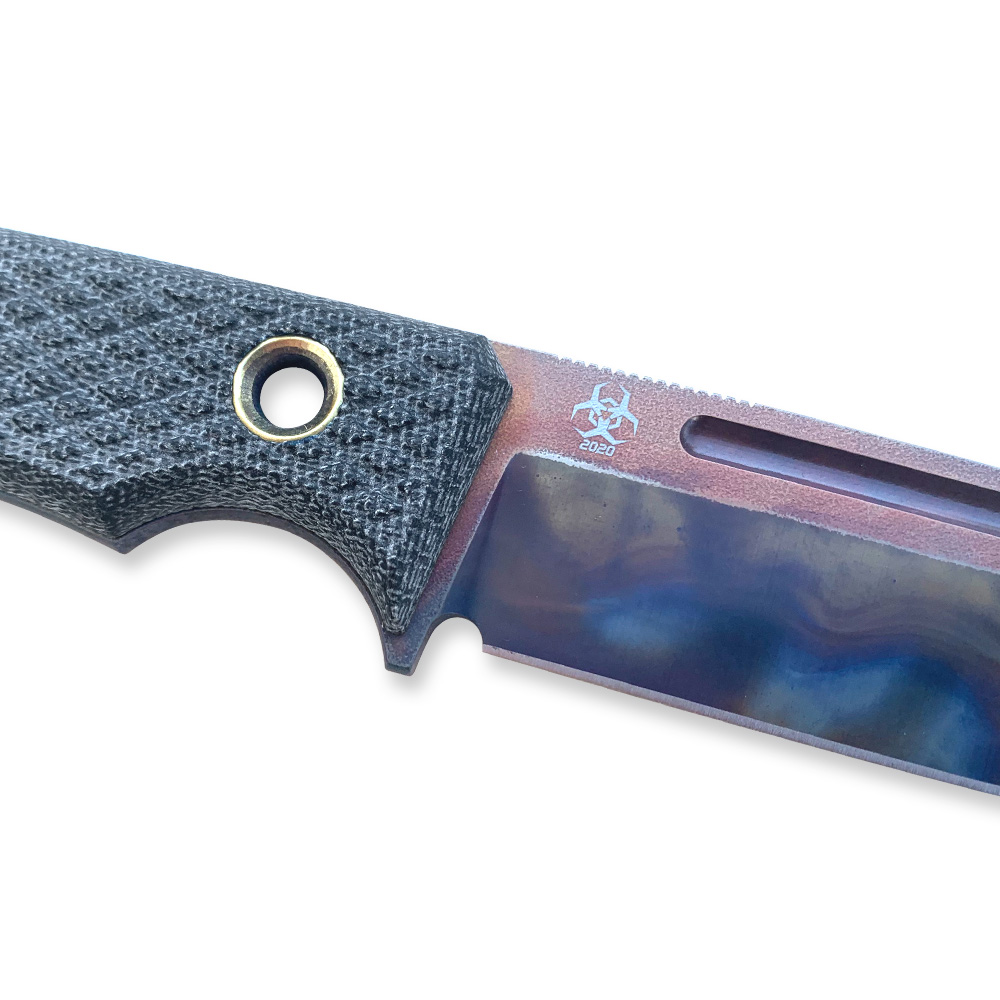 Korpus prezentowanego noża Speed Demon, wykonany ze stali premium M390 charakteryzuje przepiękne apokaliptyczne wykończenie, inne i niepowtarzalne dla każdej sztuki. Stając się właścicielem tego modelu możemy mieć pewność, że z jednej strony: otrzymamy konkretną wartość w postaci docenionego w wielu krajach sprawdzonego projektu, z drugiej: będziemy posiadaczami egzemplarza jedynego w swoim rodzaju. Oprócz loga TRC Knives, nazwy noża i jego numeru seryjnego na głowni znajdziemy charakterystyczny dla mini serii symbol “biohazard” z wygrawerowanym rokiem 2022. Jest to oczywiste odniesienie do sytuacji zagrożenia wirusowego, które wystąpiło na całej Ziemi, stawiając jednostki, społeczeństwa i kraje w niespotykanej w ostatnich latach sytuacji wyjątkowej, faktycznie zmieniającej nasze dotychczasowe egzystowanie.