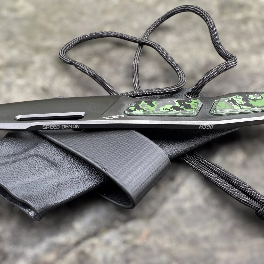 Speed Demon to nóż o konstrukcji full tang (z jednego starannie wyselekcjonowanego kawałka materiału) z najwyższej jakości stali M390. M390 to jedna z kilku stali dostępnych na rynku znajdujących się w absolutnym topie jakościowym materiałów służących do produkcji noży premium. Najlepsze jej właściwości uzyskuje się poprzez właściwe wykonanie procesu hartowania, w którym bezbłędnie muszą być przeprowadzone 3 etapy: utwardzanie, chłodzenie kriogeniczne (wymrażanie) i odpuszczanie (więcej o procesie wytwórczym TRC Knives znajdziesz w rozmowie z Andriusem Triciusem, którą możesz przeczytać tutaj). Właściwie przygotowane ostrze ze stali M390 jest ekstremalnie wytrzymałe na przeciążenia, niezwykle długo pozostaje ostre (bardzo wolno się ściera) i ma doskonałe właściwości antykorozyjne.