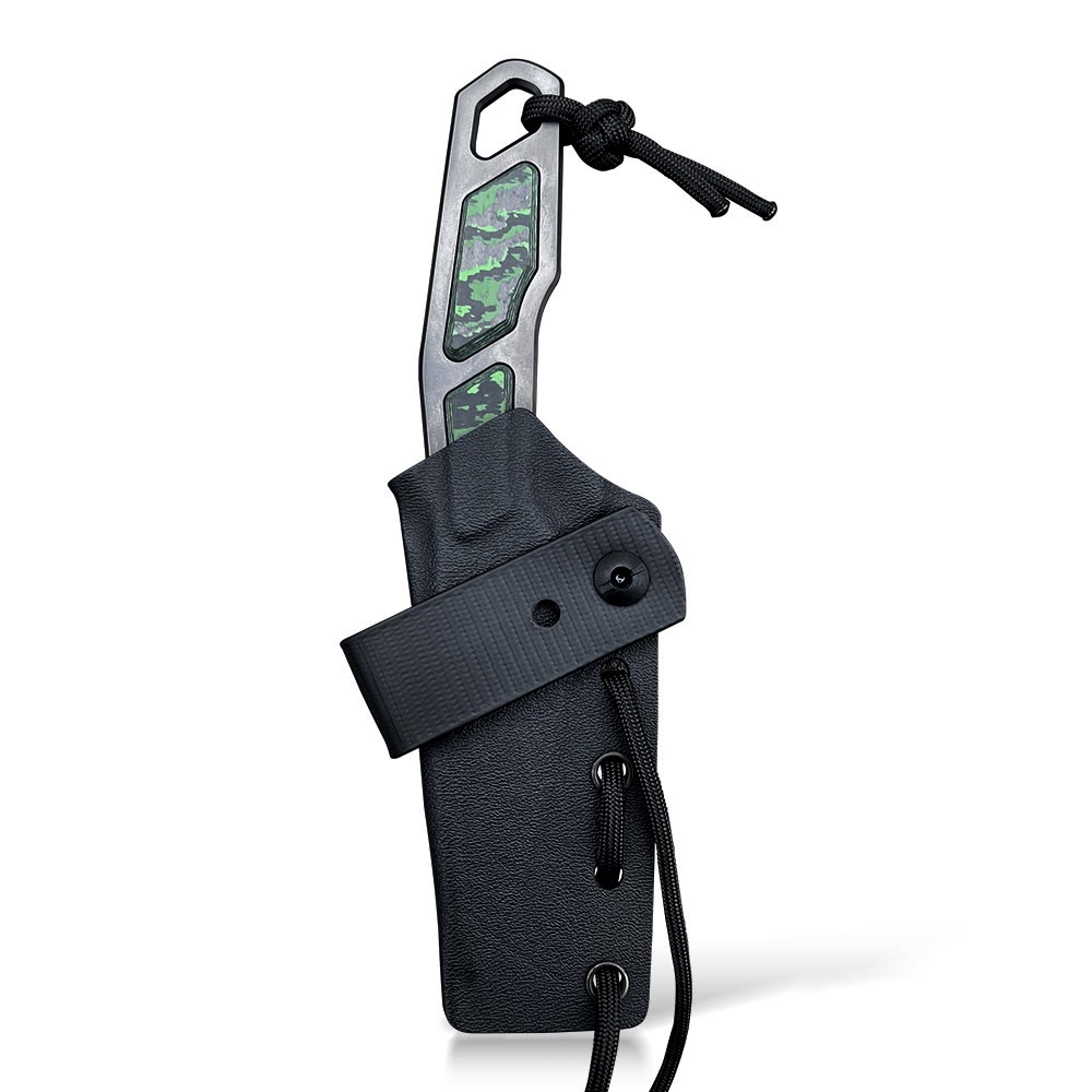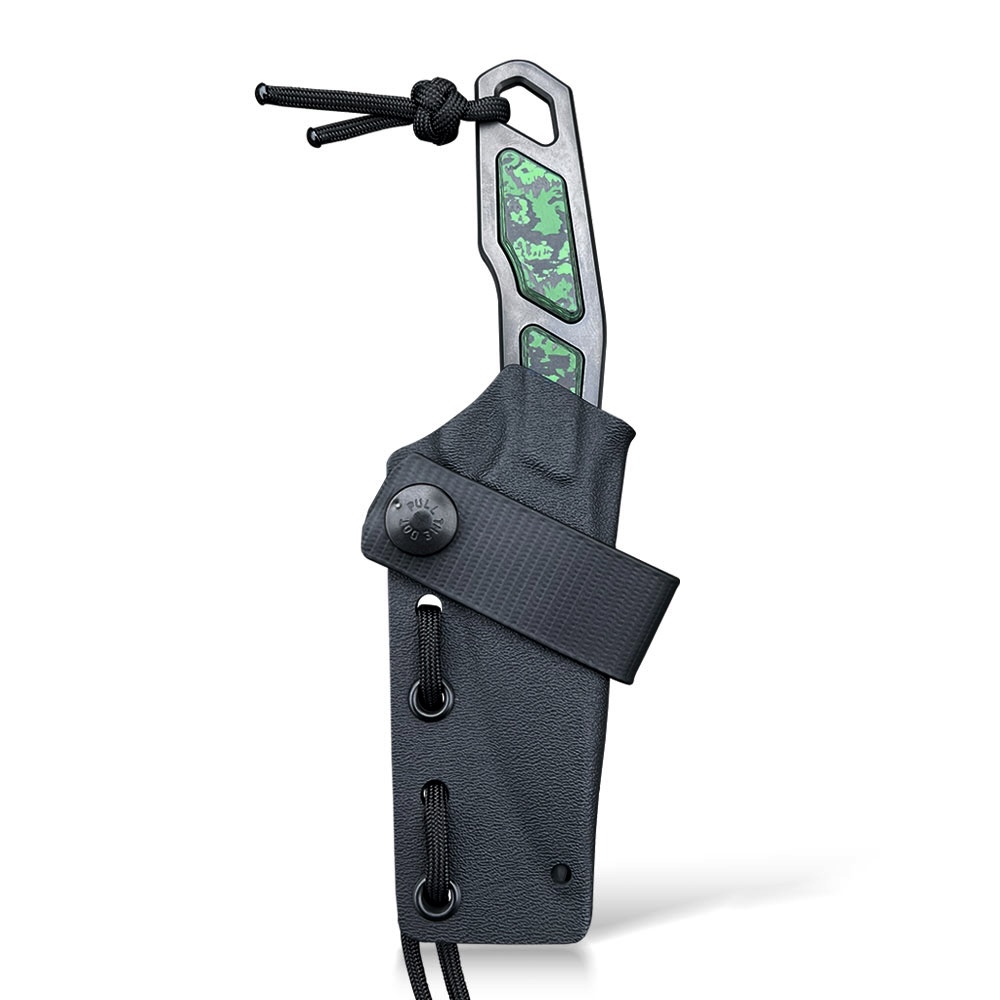 W zestawie z nożem otrzymujemy kaburę z ręcznie formowanego tworzywa Kydex w kolorze czarnym, którą przytwierdzamy do paska za pomocą przelotki. Taki sposób przenoszenia sprawia, że nóż czeka w pełnej gotowości bezpośrednio na wysokości opuszczonej ręki. Dla ułatwienia w wyjmowaniu noża, który bardzo dobrze opina ciasno dopasowane tworzywo zaplanowano podporę na kciuk, dzięki której nóż możemy wyjąć w sposób kontrolowany i bezpieczny. Sam Kydex cechuje się wysoką odpornością na uderzenia, zarysowania, charakteryzuje się niską chłonnością wilgoci, odpornością na różnorodne warunki atmosferyczne oraz wiele środków chemicznych. Kabury z niego wykonane użytkujemy wygodnie i długotrwale. Kabura zaopatrzona została w piny przelotowe, do których oryginalnie dołączony jest sporej długości odcinek paracordu, aby nóż można było swobodnie zawiesić na szyję (jako nóż typu neck). Ten sposób mocowania rekomendujemy w sytuacjach, kiedy chcemy aby nóż był maksymalnie dostępny i szybko gotowy do działania.