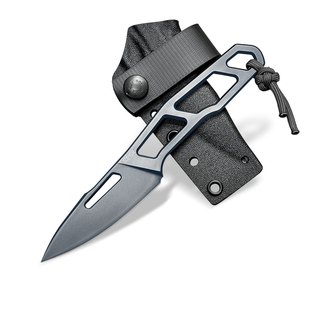 W zestawie z nożem otrzymujemy kaburę z ręcznie formowanego tworzywa Kydex w kolorze czarnym, którą przytwierdzamy do paska za pomocą przelotki. Taki sposób przenoszenia sprawia, że nóż czeka w pełnej gotowości bezpośrednio na wysokości opuszczonej ręki. Dla ułatwienia w wyjmowaniu noża, który bardzo dobrze opina ciasno dopasowane tworzywo zaplanowano podporę na kciuk, dzięki której nóż możemy wyjąć w sposób kontrolowany i bezpieczny. Sam Kydex cechuje się wysoką odpornością na uderzenia, zarysowania, charakteryzuje się niską chłonnością wilgoci, odpornością na różnorodne warunki atmosferyczne oraz wiele środków chemicznych. Kabury z niego wykonane użytkujemy wygodnie i długotrwale. Kabura zaopatrzona została w piny przelotowe, do których oryginalnie dołączony jest sporej długości odcinek paracordu, aby nóż można było swobodnie zawiesić na szyję (jako nóż typu neck). Ten sposób mocowania rekomendujemy w sytuacjach, kiedy chcemy aby nóż był maksymalnie dostępny i szybko gotowy do działania.