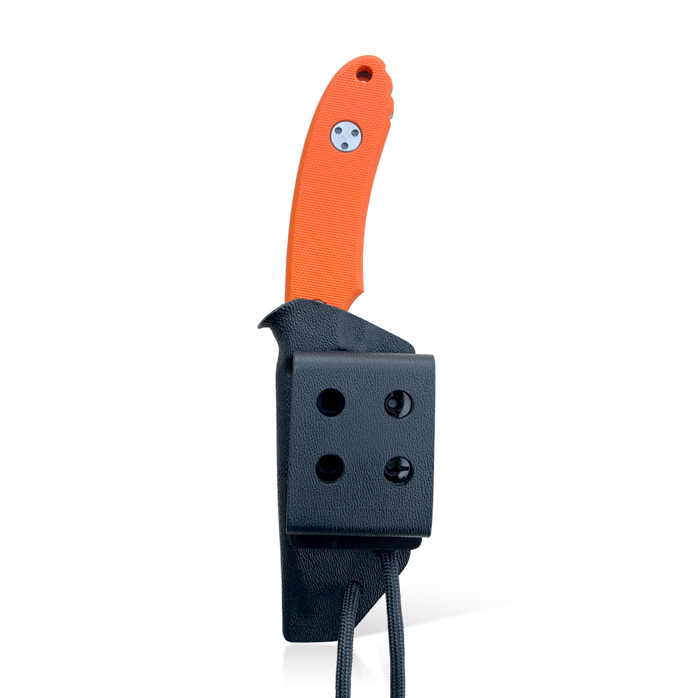 W zestawie z nożem otrzymujemy kaburę z ręcznie formowanego tworzywa Kydex w kolorze czarnym, którą przytwierdzamy do paska za pomocą klamry z Kydexu. Dla ułatwienia w wyjmowaniu noża, który bardzo dobrze opina ciasno dopasowane tworzywo zaplanowano podporę na kciuk, dzięki której nóż możemy wyjąć w sposób kontrolowany i bezpieczny. Sam Kydex cechuje się wysoką odpornością na uderzenia, zarysowania, charakteryzuje się niską chłonnością wilgoci, odpornością na różnorodne warunki atmosferyczne oraz wiele środków chemicznych. Kabury z niego wykonane użytkujemy wygodnie i długotrwale. Kabura zaopatrzona została w piny przelotowe, do których można przypiąć np. uchwyt na krzesiwo (nie znajduje się w zestawie) lub użyć ich do jej zamocowania na plecaku, elemencie uprzęży czy rozwiązaniu typu MOLLE.NAZWA: TR-12s