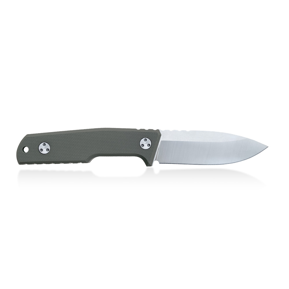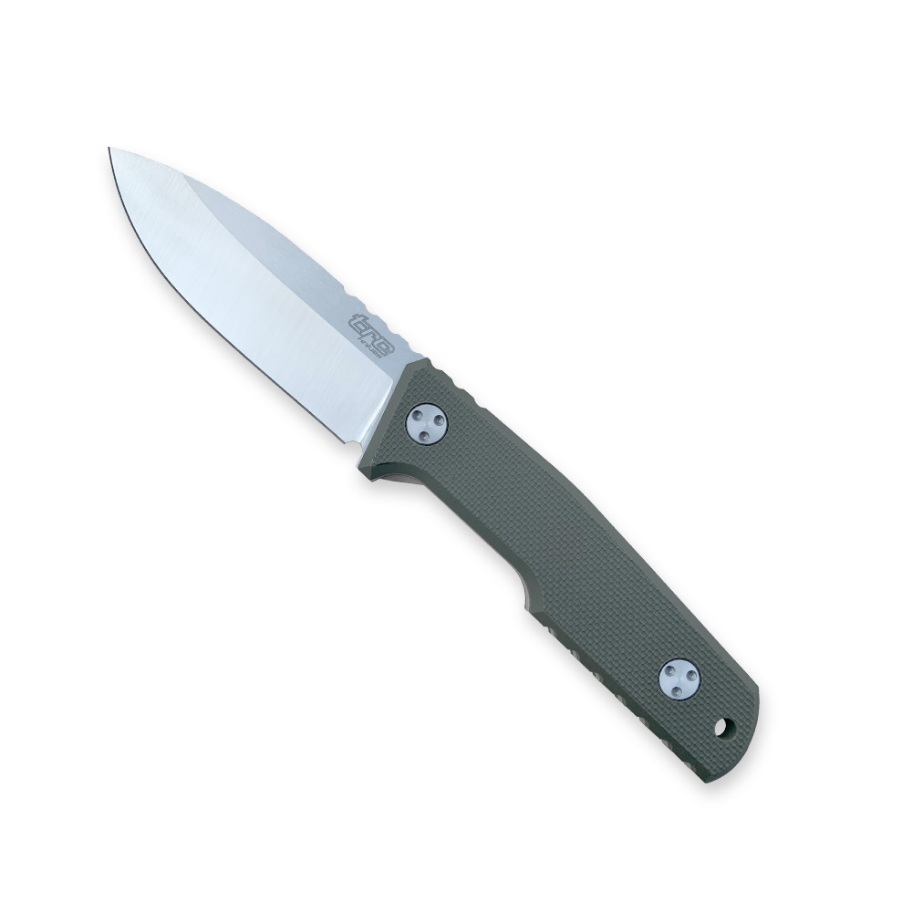 Okładziny rękojeści o ergonomicznym, zowalizowanym kształcie wykonane zostały z oliwkowego kompozytu G10 odpornego na wilgoć, zmiany temperatury, większość rozpuszczalników i kwasów, posiadającego wysoką odporność na uszkodzenia mechaniczne. Materiał ma antypoślizgową, chropowatą strukturę, które czynią chwyt bardziej stabilnym. Okładziny zamontowano w sposób trwały. Zostały one przyklejone i przykręcone ozdobnymi nierdzewnymi śrubami wyglądem spójnymi z ogólnym designem noża. Śruby są zamontowane na stałe, nie należy ich odkręcać samodzielnie aby nie utracić gwarancji. Całość przemyślanej konstrukcji sprawia, że rękojeść bardzo dobrze dopasowuje się do dłoni a chwyt jest mocny i pewny. Na zakończeniu rękojeści zaprojektowano otwór na na zamocowanie dodatkowej linki, która może służyć jako zabezpieczenie przed upuszczeniem noża podczas pracy, lub dodatkowy chwytak ułatwiający wyjmowanie noża z kabury.