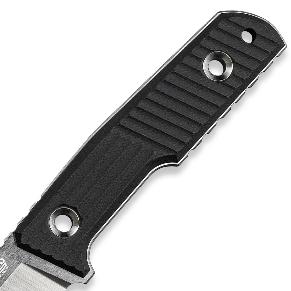 **WYTRZYMAŁA RĘKOJEŚĆ**: Okładziny rękojeści wykonane zostały z kompozytu G10, materiału odpornego na wilgoć, zmiany temperatury, większość rozpuszczalników i kwasów, posiadającego wysoką odporność na uszkodzenia mechaniczne. G10 ma antypoślizgową, chropowatą strukturę. W okładzinach znajdziemy dodatkowo stalowe przelotowe piny, które z jednej strony służą do ich mocowania (oprócz klejenia) i można je wykorzystać do zaplecenia dodatkowego paracordu.
