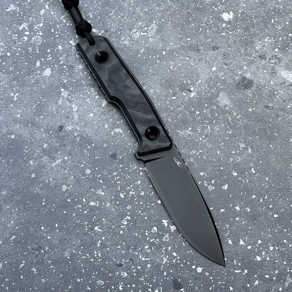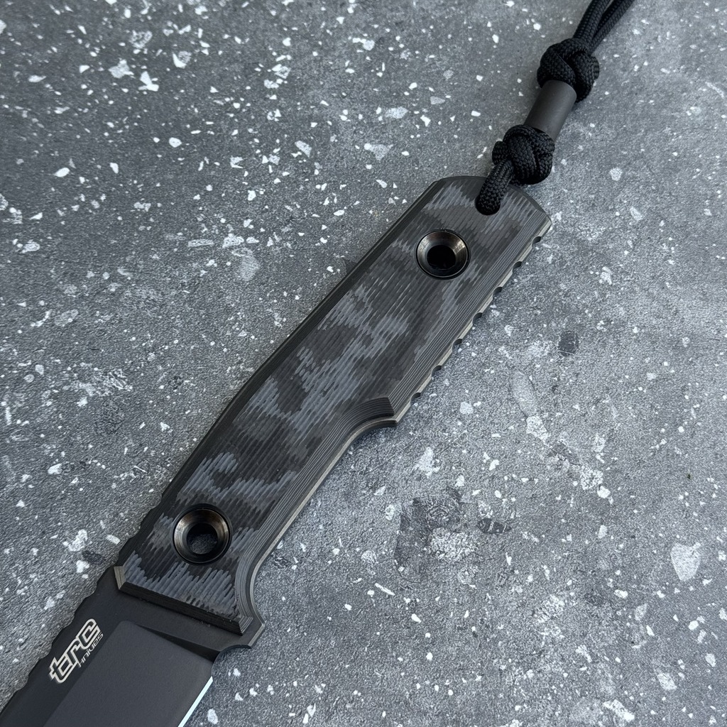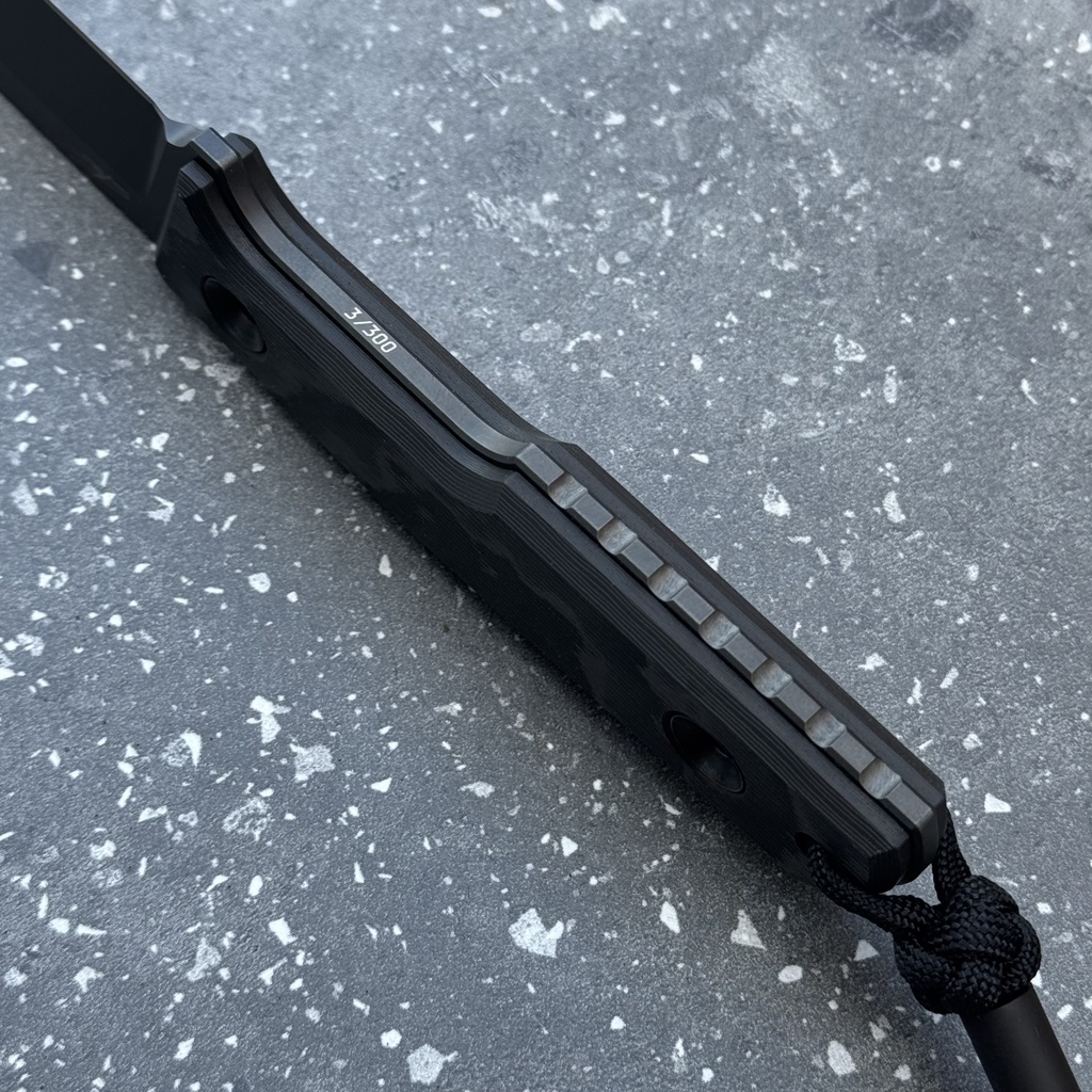 *Prezentowane wykonanie to limitowana do 300 sztuk ekskluzywna seria z ostrzem ze stali Elmax powleczonym czarną powłoką typu DLC oraz rękojeścią z wyjątkowego włókna węglowego o fakturze 'Camo’ (Black Camo Carbon Fiber). Nóż dostarczany jest wraz z czarnym koralikiem oraz czarną pochwą Kydex z mocowaniem w formie pokrytego nylonem paska przypinanego zatrzaskiem Pul-The-Dot (zatrzask możliwy do otwarcia tylko w jednym kierunku). Ostrze wyróżnia charakteryzujący sztuki 'custom’ podpis na głowni twórcy TRC Andriusa Triciusa (signature edition).