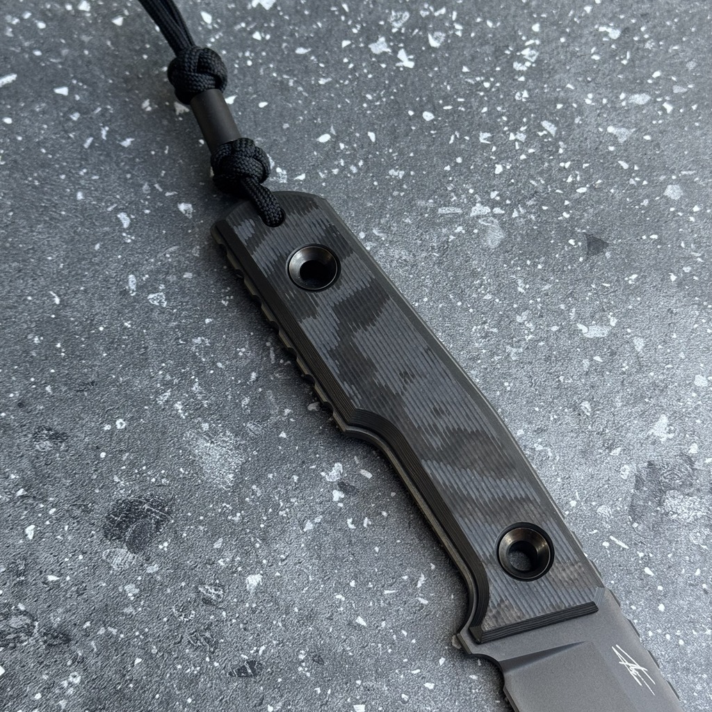 **WYTRZYMAŁA RĘKOJEŚĆ**: Okładziny rękojeści wykonane zostały z ekskluzywnego włókna węglowego. W okładzinach znajdziemy dodatkowo stalowe przelotowe piny, które z jednej strony służą do ich mocowania (oprócz klejenia) i można je wykorzystać do zaplecenia dodatkowego paracordu.