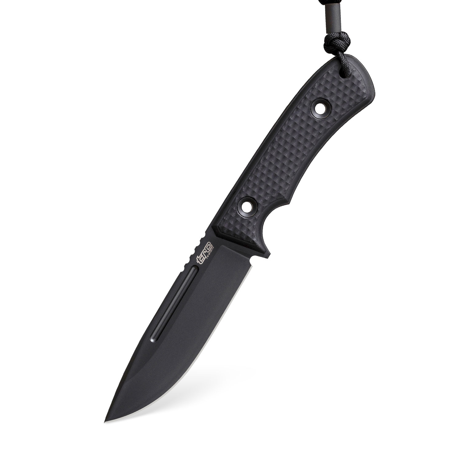 **WYTRZYMAŁA I KOMFORTOWA RĘKOJEŚĆ**: Całość ergonomicznie zaprojektowanej konstrukcji sprawia, że rękojeść bardzo dobrze dopasowuje się do dłoni a chwyt jest mocny i pewny. W rękojeści znajdują się przelotowe piny, które z jednej strony służą do mocowania okładek (oprócz klejenia) a z drugiej wykorzystywane są na zamocowanie dodatkowej linki, która może służyć jako zabezpieczenie przed upuszczeniem noża podczas pracy, lub dodatkowy chwytak ułatwiający wyjmowanie noża z kabury.