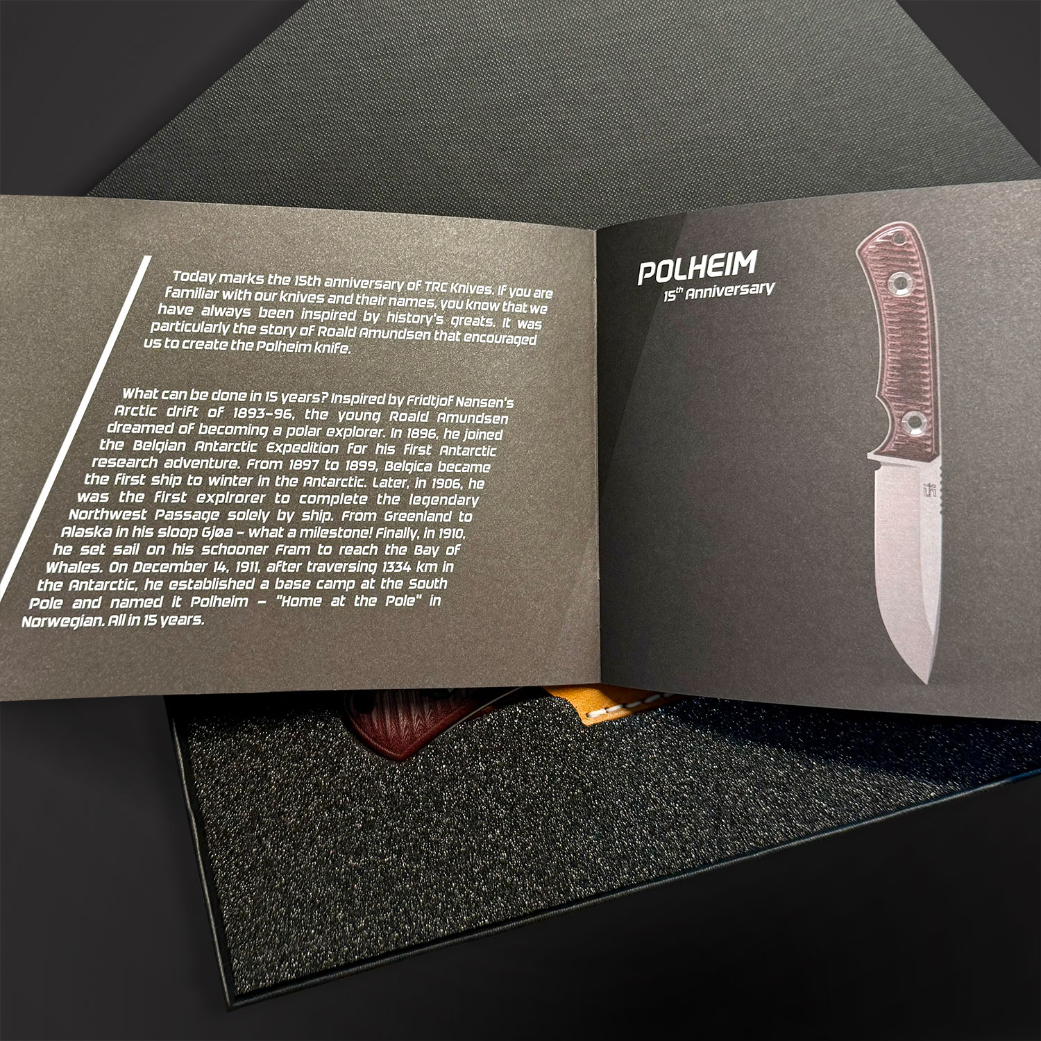 Nóż TRC Knives Polheim 15th Anniversary Edition Knife. Polheim – „Home at the Pole” zaprojektowany i wykonany do realizacji różnorodnych zadań w terenie. Jego nazwa podkreśla bardzo użytkowy charakter a design i cechy potwierdzają jego uniwersalność.
