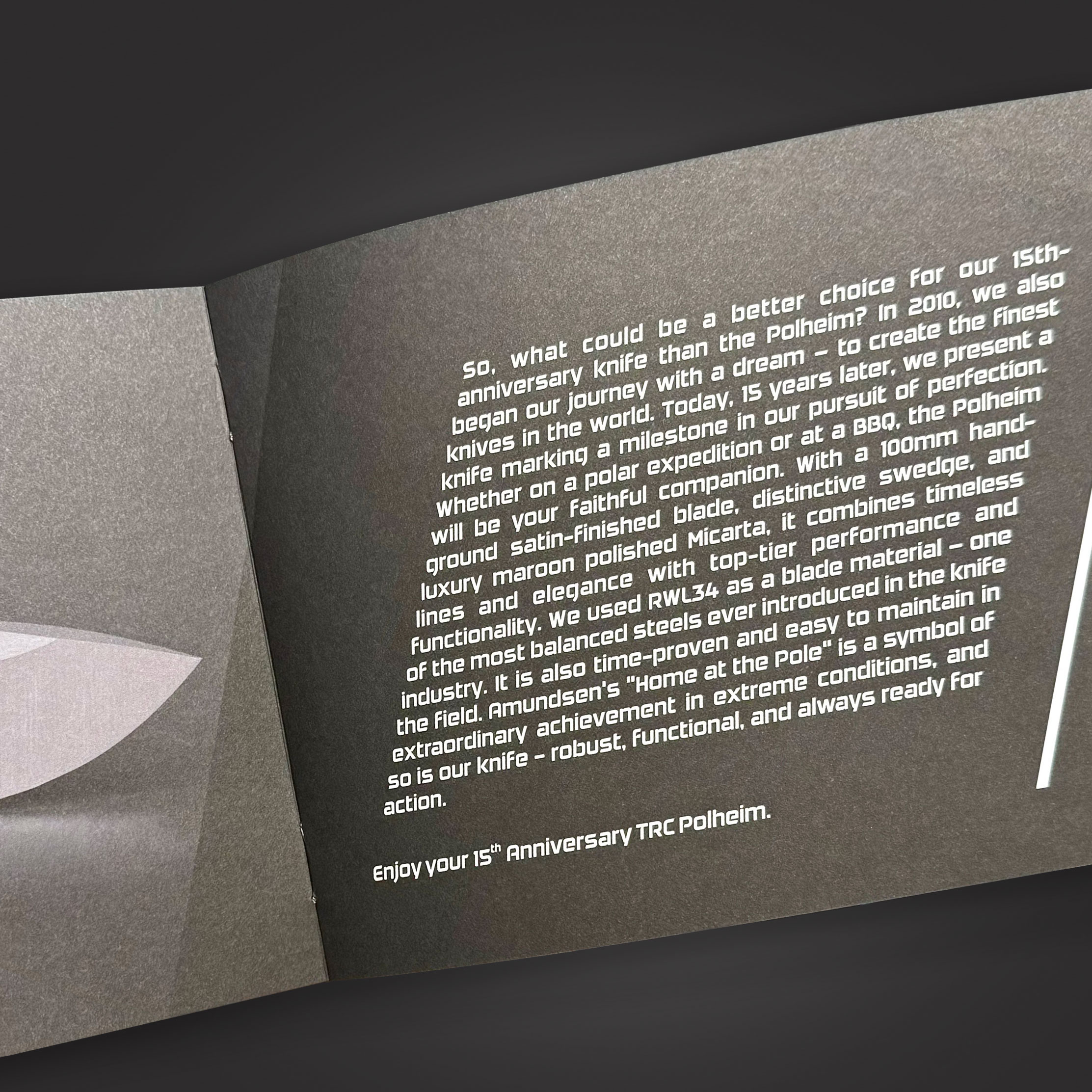 - Książeczka produktu / certyfikat autentyczności (Knife ID Book) – edycja na 15-lecie