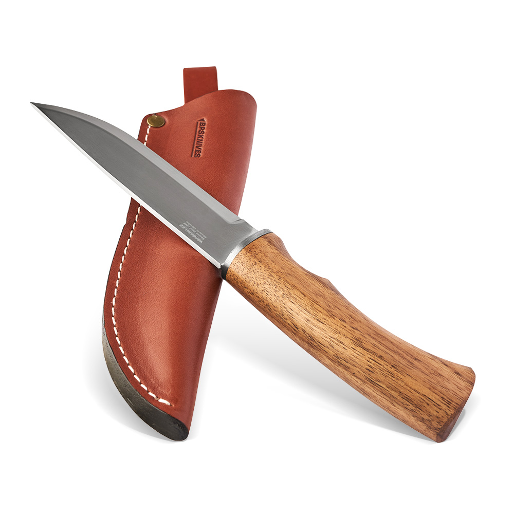 Nóż turystyczny BPS Knives BK06 Camping Stal Nierdzewna posiada roboczy profil ostrza typu drop point ze szlifem skandynawskim. Ostrze ze stali nierdzewnej 5Cr14MoV ma polerowane wykończenie a rękojeść wykonana została z drewna orzechowego (walnut wood). W komplecie z nożem znajduje się zdobiona przeszyciami kabura z brązowej skóry.