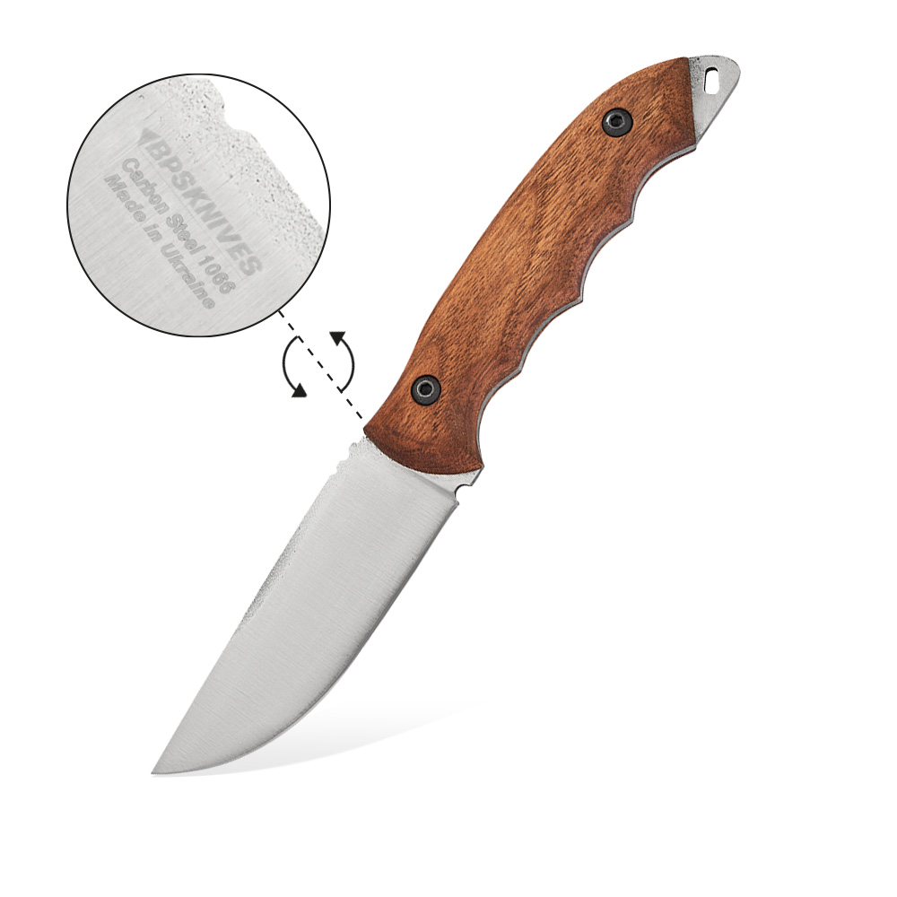 Nóż turystyczny BPS Knives HK4 Camping Stal Węglowa to nóż o konstrukcji full tang, wykonany z jednego odcinka stali przebiegającego przez całą długość i szerokość rękojeści, do której przymocowano okładki z drewna.