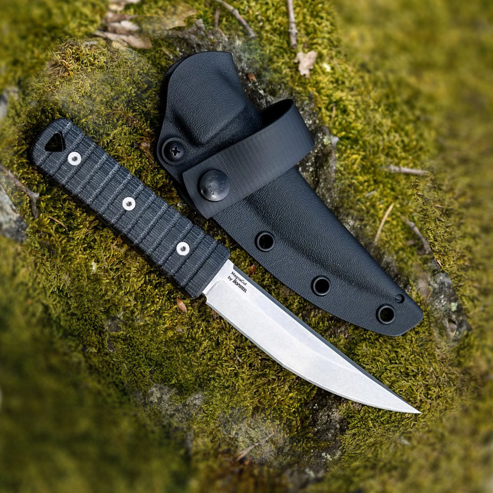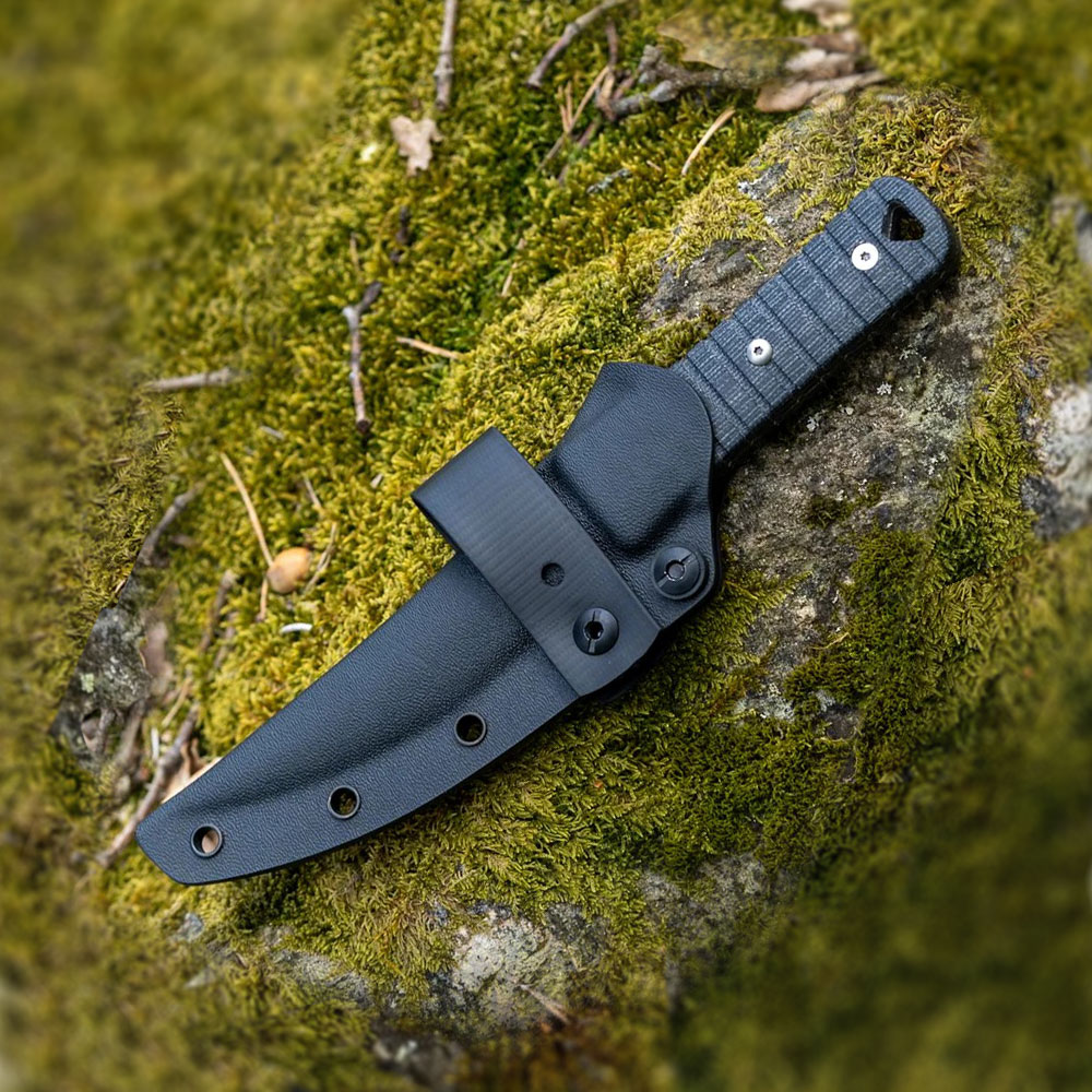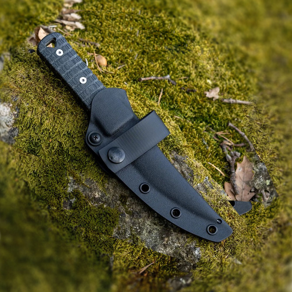 W zestawie z nożem otrzymujemy kaburę z ręcznie formowanego tworzywa Kydex w kolorze czarnym. Dla ułatwienia w wyjmowaniu noża, który bardzo dobrze opina ciasno dopasowane tworzywo zaplanowano podporę na kciuk, dzięki której nóż możemy wyjąć w sposób kontrolowany i bezpieczny. Sam Kydex cechuje się wysoką odpornością na uderzenia, zarysowania, charakteryzuje się niską chłonnością wilgoci, odpornością na różnorodne warunki atmosferyczne oraz wiele środków chemicznych. Kabury z niego wykonane użytkujemy wygodnie i długotrwale. Kabura zaopatrzona została w 4 piny przelotowe, przez które w razie potrzeby przewlekamy linkę, czy paracord, lub przy pasku w pozycji poziomej lub pionowej w zależności od preferencji użytkownika. Dla prostego i szybkiego montażu kabura została zaopatrzona w dodatkową przelotkę (szlufkę na pasek) zapinaną na zatrzask Pull-The-Dot otwierany i zamykany pod odpowiednim kątem tylko z jednej strony, co stanowi zabezpieczenie przed samoczynnym otwarciem.