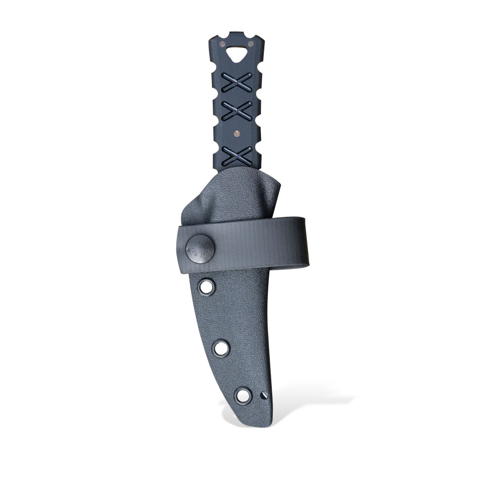 W zestawie z nożem otrzymujemy kaburę z ręcznie formowanego tworzywa Kydex w kolorze czarnym. Dla ułatwienia w wyjmowaniu noża, który bardzo dobrze opina ciasno dopasowane tworzywo zaplanowano podporę na kciuk, dzięki której nóż możemy wyjąć w sposób kontrolowany i bezpieczny. Sam Kydex cechuje się wysoką odpornością na uderzenia, zarysowania, charakteryzuje się niską chłonnością wilgoci, odpornością na różnorodne warunki atmosferyczne oraz wiele środków chemicznych. Kabury z niego wykonane użytkujemy wygodnie i długotrwale. Kabura zaopatrzona została w 4 piny przelotowe, przez które w razie potrzeby przewlekamy linkę, czy paracord służące do przenoszenia noża na szyi (jako neck), lub przy pasku w pozycji poziomej lub pionowej w zależności od preferencji użytkownika. Dla prostego i szybkiego montażu kabura została zaopatrzona w dodatkową przelotkę (szlufkę na pasek), zapinaną na zatrzask posiadający zabezpieczenie przed samoczynnym otwarciem Pull-the-DOT (zatrzask otwierające się tylko jednostronnie i w sposób kontrolowany). Samą przelotkę wykonano z włókien zatopionych w twardym gumowanym tworzywie, które zachowuje elastyczność w ekstremalnych temperaturach.