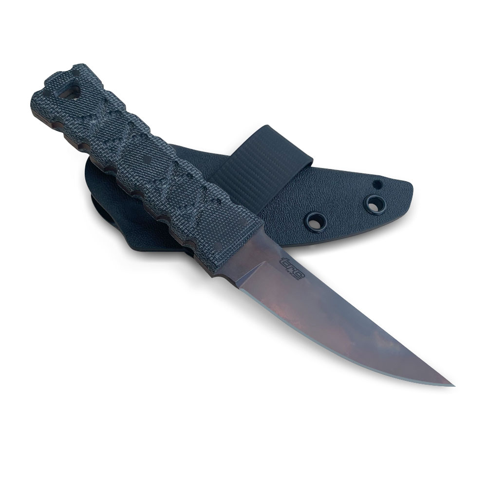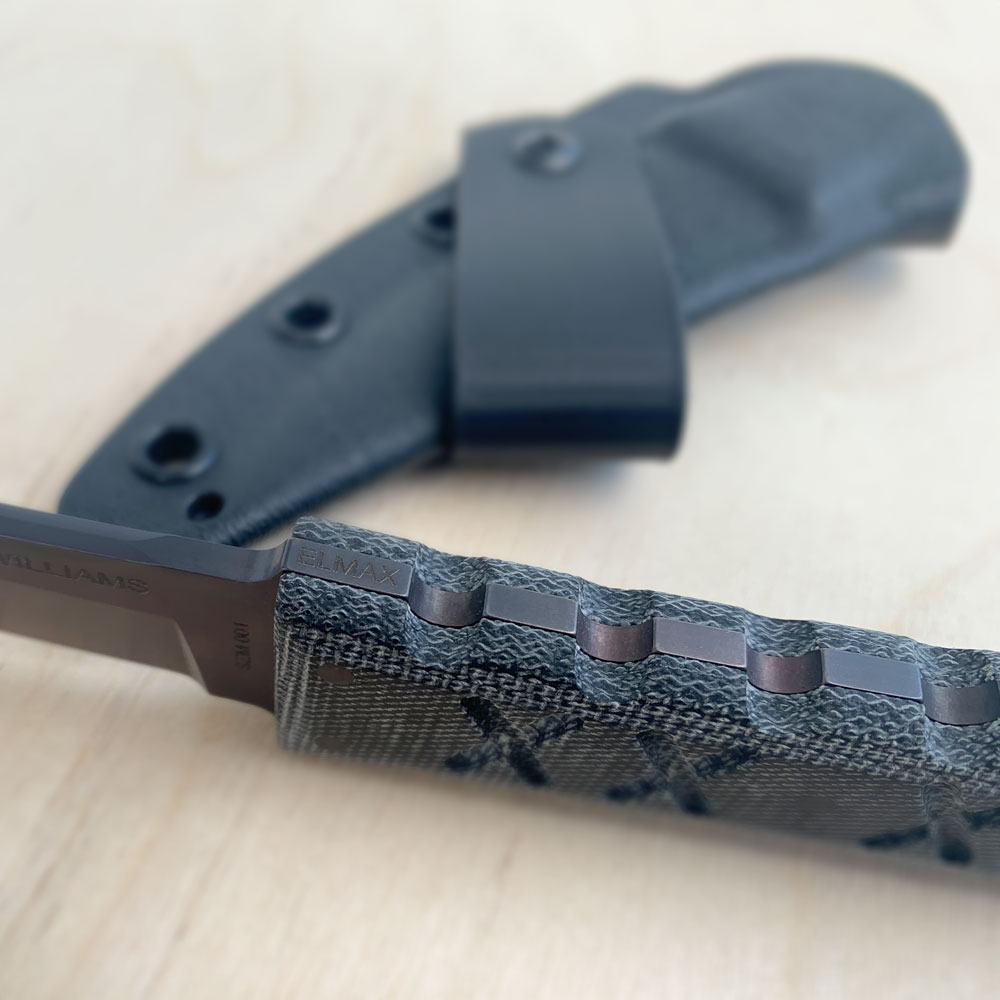 Okładziny rękojeści wykonane zostały z czarnego laminatu Canvas Micarta odpornego na wilgoć, zmiany temperatury, większość rozpuszczalników i kwasów, posiadającego wysoką odporność na uszkodzenia mechaniczne. Micarta znana ze swoich doskonałych właściwości, również wizualnych (daje się stylizować na naturalny materiał) ma antypoślizgową, chropowatą strukturę. Rękojeść posiada charakterystyczne nacięcia poprawiające pewność uchwytu i umożliwiające zaplecenie na niej dodatkowej linki, czy paracordu, kiedy chcemy aby rękojeść była grubsza i jeszcze bardziej chwytna.