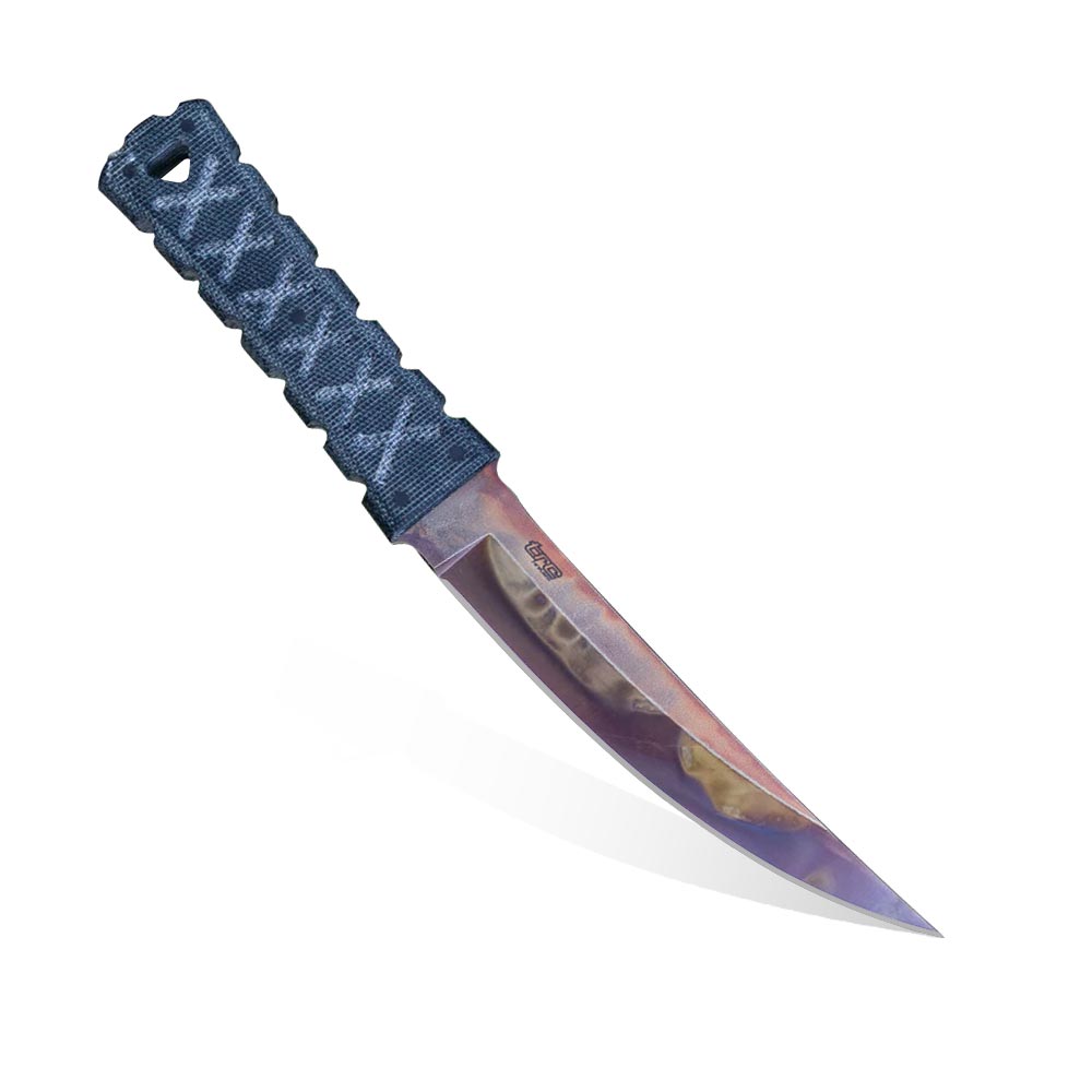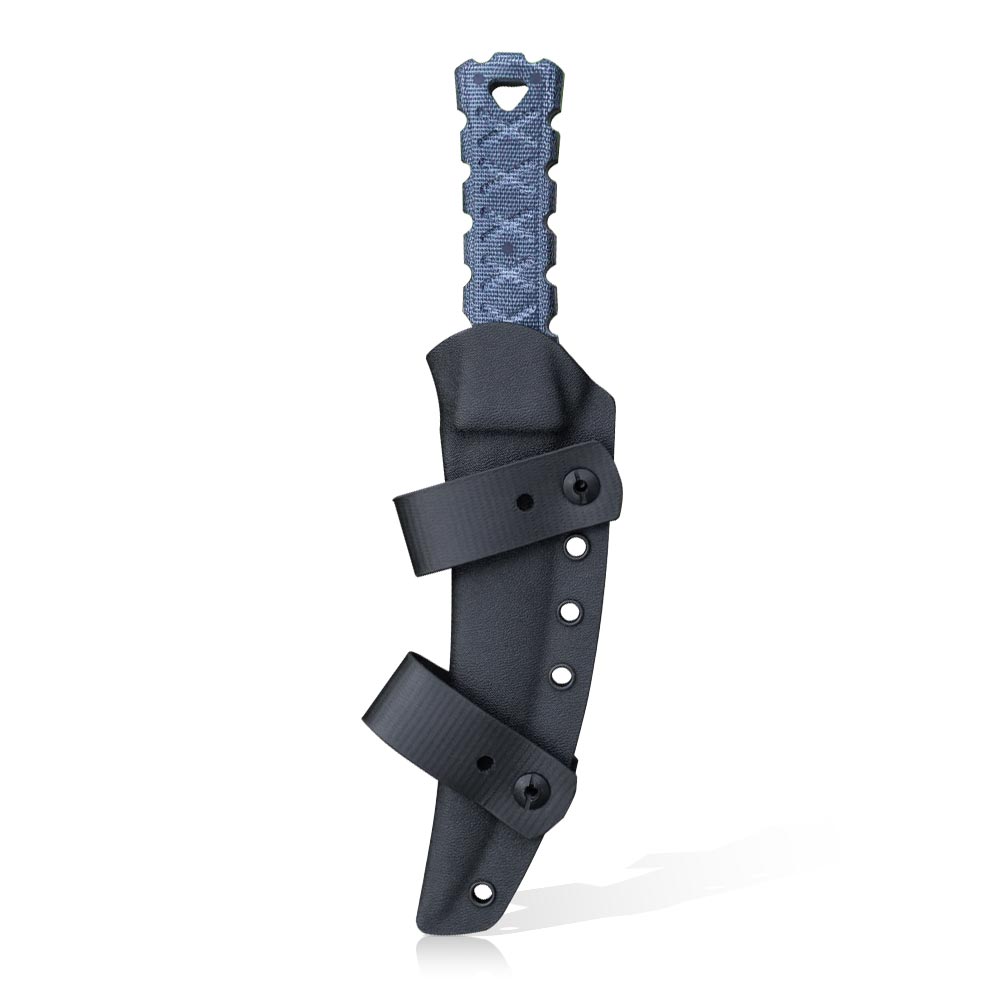 W zestawie z nożem otrzymujemy kaburę z ręcznie formowanego tworzywa Kydex w kolorze czarnym. Dla ułatwienia w wyjmowaniu noża, który bardzo dobrze opina ciasno dopasowane tworzywo zaplanowano podporę na kciuk, dzięki której nóż możemy wyjąć w sposób kontrolowany i bezpieczny. Sam Kydex cechuje się wysoką odpornością na uderzenia, zarysowania, charakteryzuje się niską chłonnością wilgoci, odpornością na różnorodne warunki atmosferyczne oraz wiele środków chemicznych. Kabury z niego wykonane użytkujemy wygodnie i długotrwale. Kabura zaopatrzona została w 4 piny przelotowe, przez które w razie potrzeby przewlekamy linkę, czy paracord służące do dodatkowego zabezpieczenia noża przed zgubieniem w trakcje przenoszenia przymocowanego np. na plecaku czy elementach uprzęży taktycznej. Dla prostego i szybkiego montażu kabura została zaopatrzona w dodatkowe przelotki (szlufki na pasek), zapinanne na zatrzaski posiadające zabezpieczenie przed samoczynnym otwarciem Pull-the-DOT (zatrzaski otwierające się tylko jednostronnie i w sposób kontrolowany). Same przelotki wykonano z włókien zatopionych w twardym gumowanym tworzywie, które zachowuje elastyczność w ekstremalnych temperaturach.