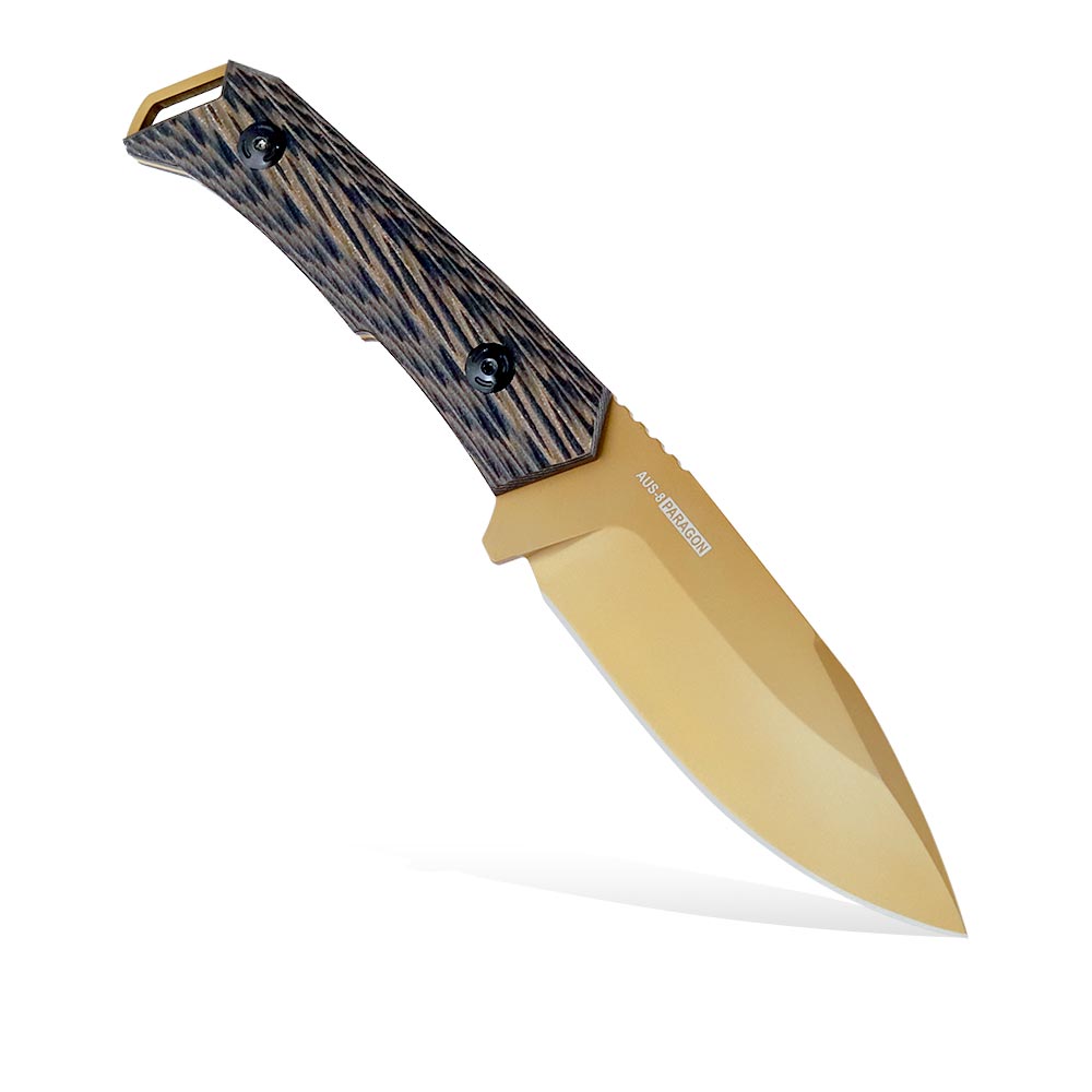 Paragon posiada konstrukcję full tang, uniwersalną głownię typu drop point ze stali nierdzewnej AUS-8 z twardą powłoką tytanową i rękojeść z teksturowanego, dwubarwnego kompozytu G10. Całość chowa się w kaburze z kydex’u z wygodnym klipsem.