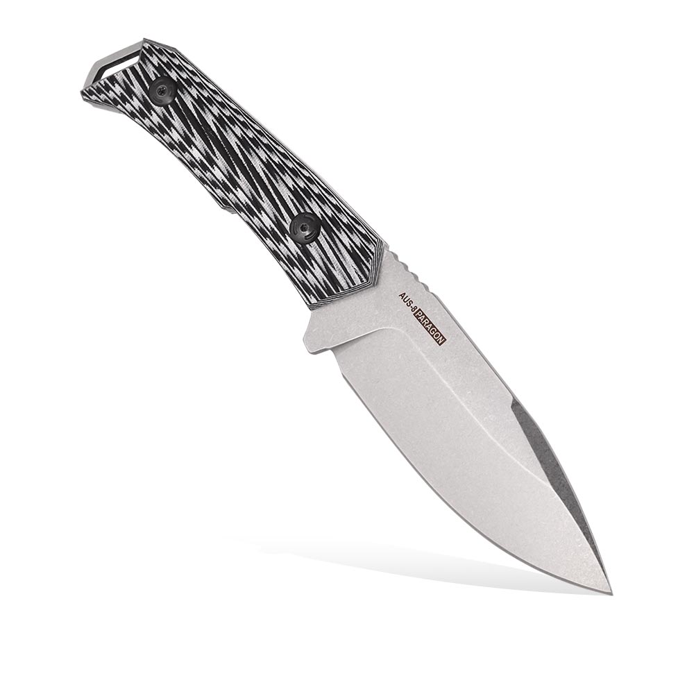 Paragon posiada konstrukcję full tang, uniwersalną głownię typu drop point ze stali nierdzewnej AUS-8 z wykończeniem stonewash i rękojeść z teksturowanego, dwubarwnego kompozytu G10. Całość chowa się w kaburze z kydex’u z wygodnym klipsem.
