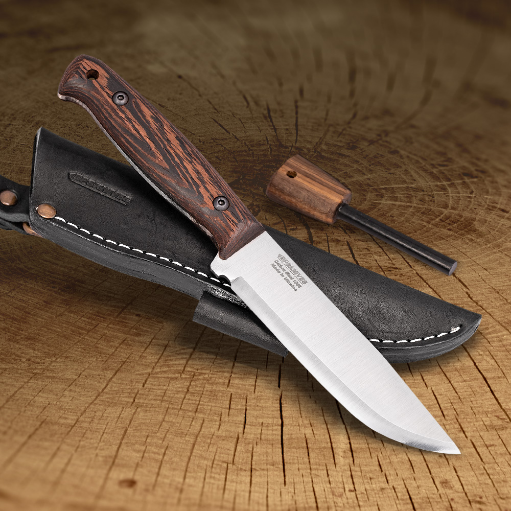 *Wyjątkowa edycja bestsellerowego noża BPS z rękojeścią z egzotycznego drewna wenge o wyróżniającej się wieloodcieniowej – brązowej kolorystyce. Robocze ostrze typu clip point ze szlifem skandynawskim i konstrukcja oparta na ostrzej i wytrzymałej stali węglowej 1066. W komplecie z nożem dostarczana jest czarna skórzana pochwa z uchwytem na krzesiwo oraz samo krzesiwo.
