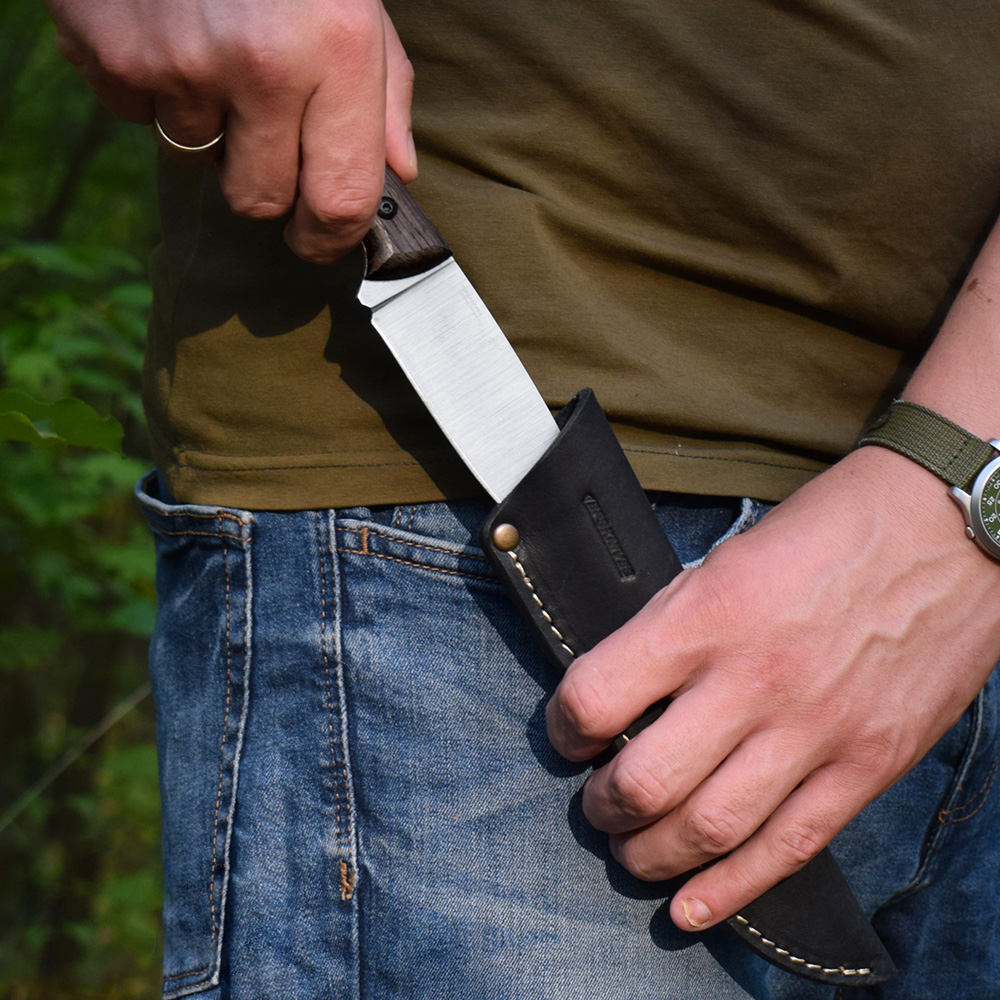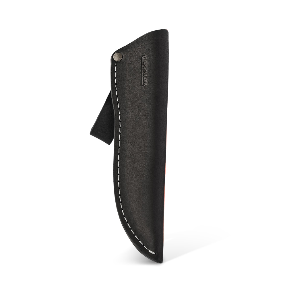 W zestawie z nożem otrzymujemy kaburę wykonaną ze skóry. Jest to klasyczne rozwiązanie pasujące stylem do narzędzia w niej się znajdującego. Drewno i skóra od zawsze stanowią idealne połączenie. Jasne przeszycia na skórze nadają jej bardzo oryginalnego wyglądu. Pochwa noża ma wysoki profil i chowa w sobie część rękojeści by lepiej zabezpieczać nóż przed wypadnięciem. Mocowana jest tradycyjnie do pasa w pozycji pionowej.