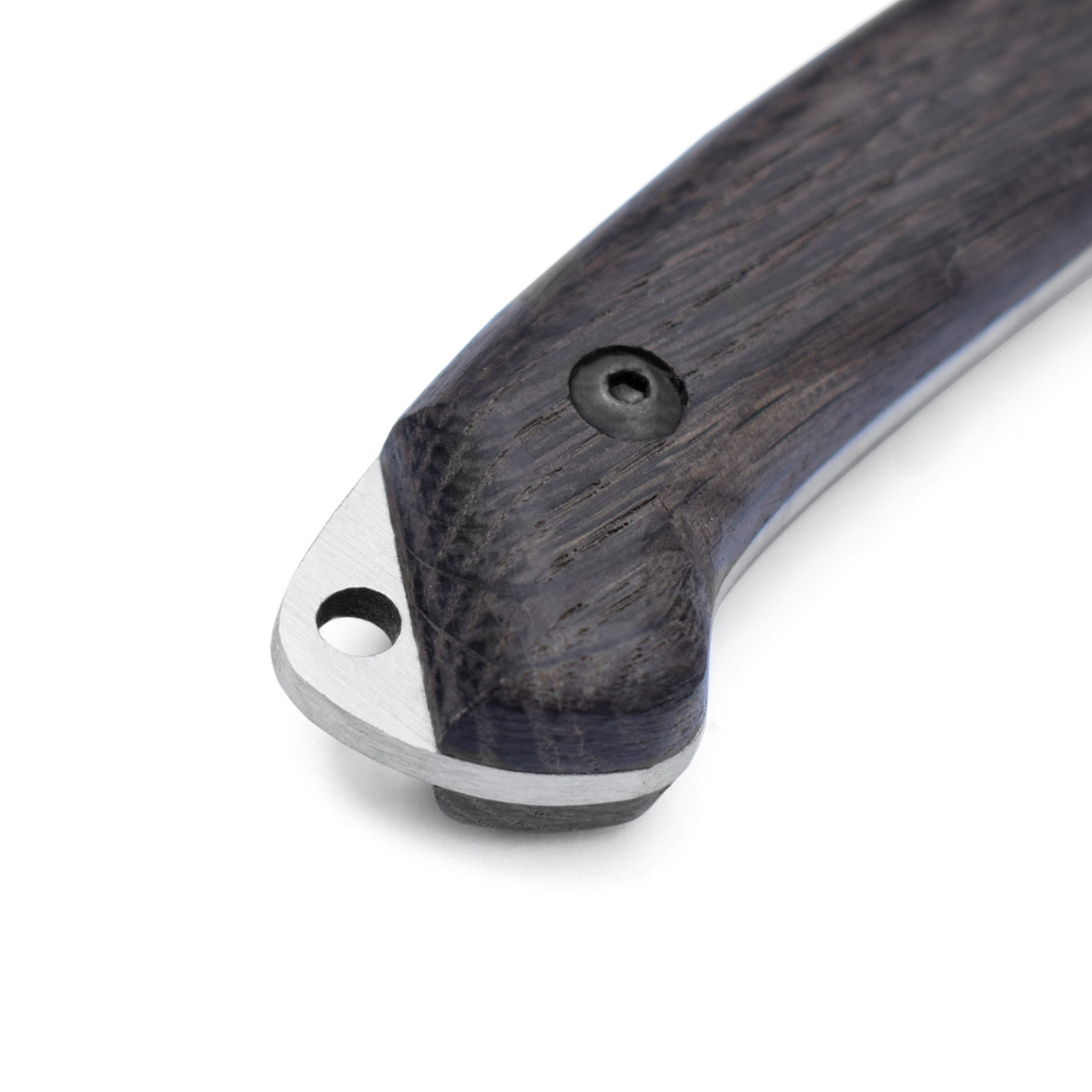 Okładziny rękojeści powstały z drewna dębu bagiennego. Drewno to od lat z powodzeniem stosowane jest jako materiał rękojeści klasycznych noży outdoor’owych. Okładziny zostały przykręcone do konstrukcji za pomocą śrub i łatwo można je zdjąć lub wymienić. Zostały też zabezpieczone Olejem Duńskim co sprawia, że są odporne na wilgoć i brud. Pozbawione okładzin zakończenie rękojeści z otworem na linkę, może służyć za zbijak do szyb lub polowy młotek.