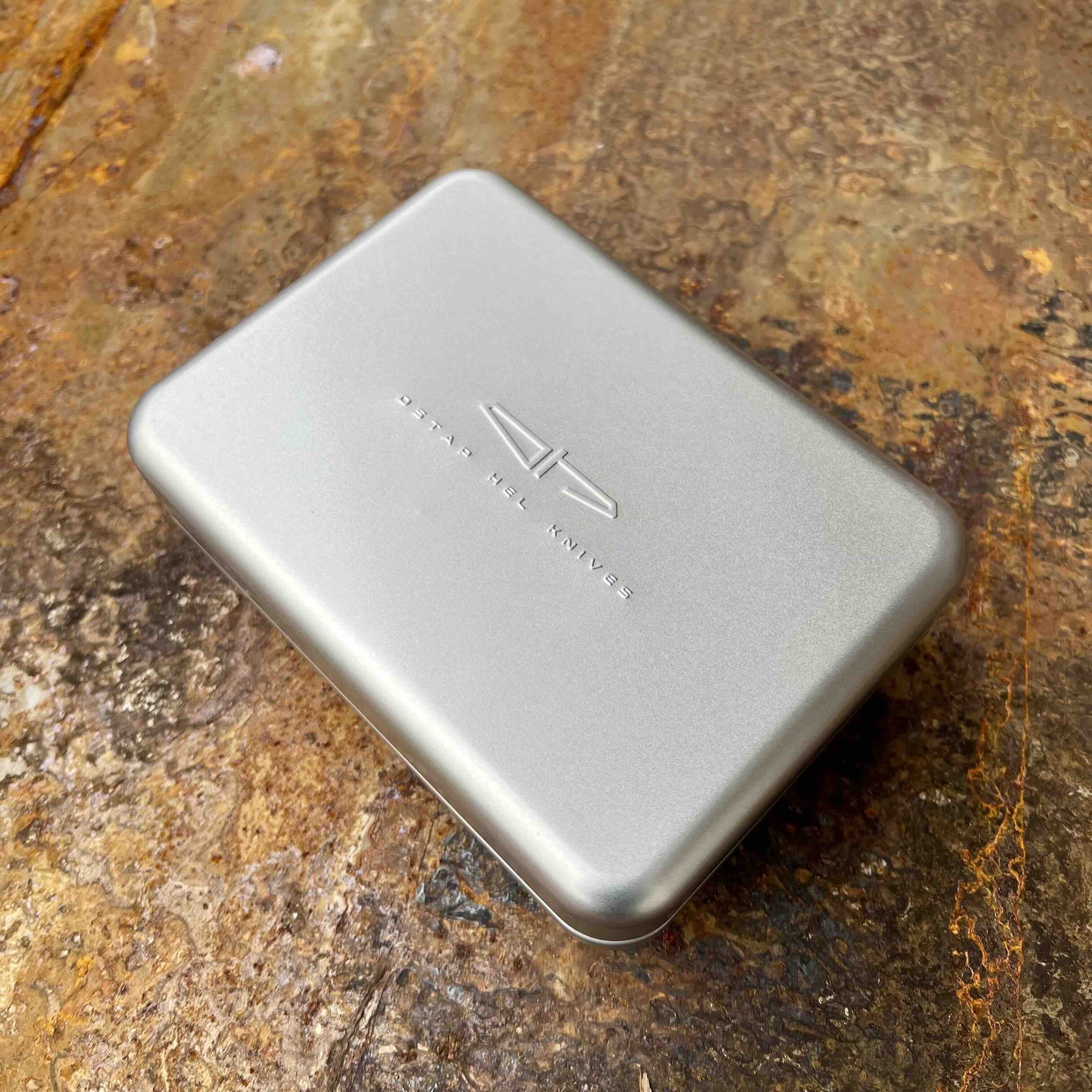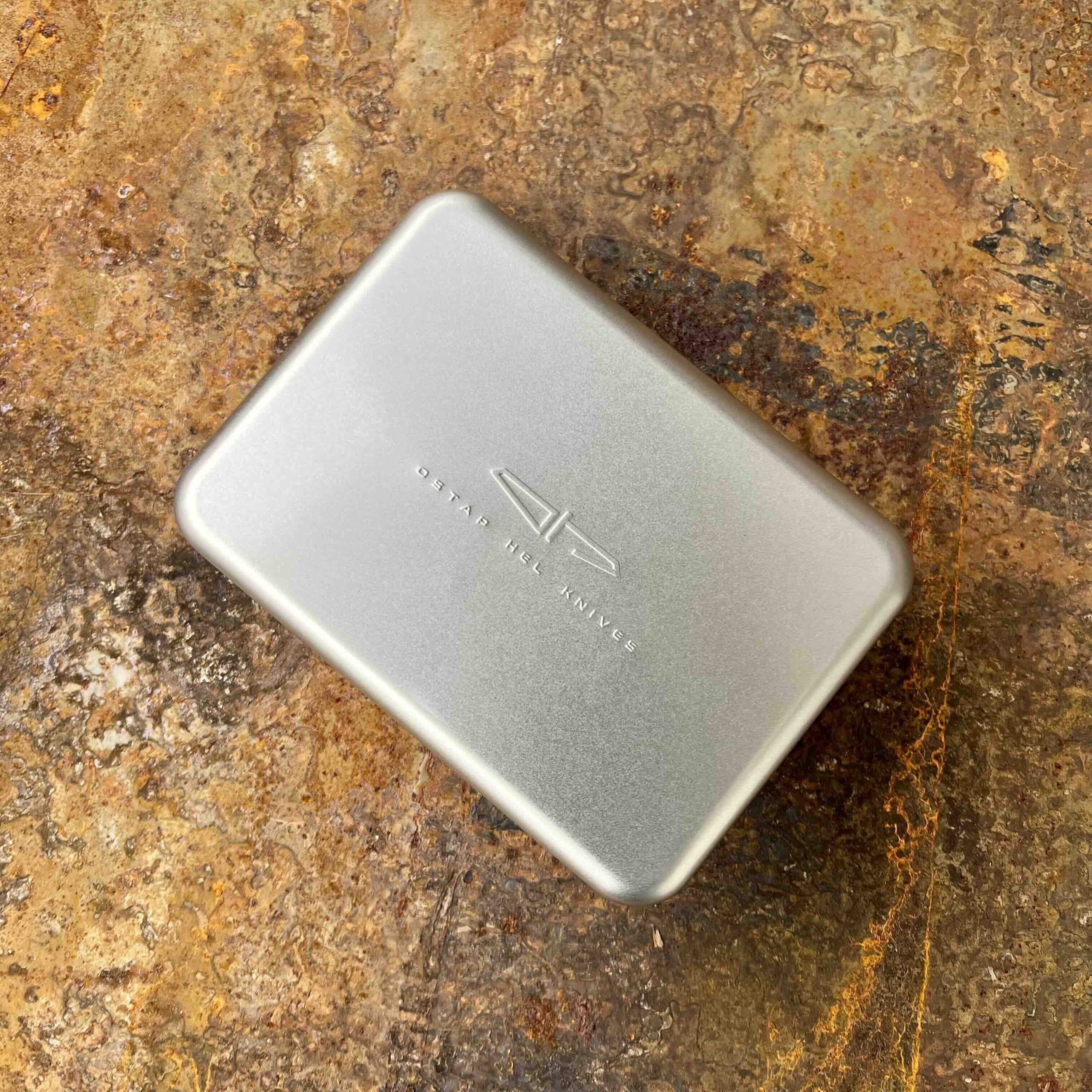 - Eleganckie pudełko aluminiowe z tłoczonym na górnym wieczku logiem Ostap Hel Knives.