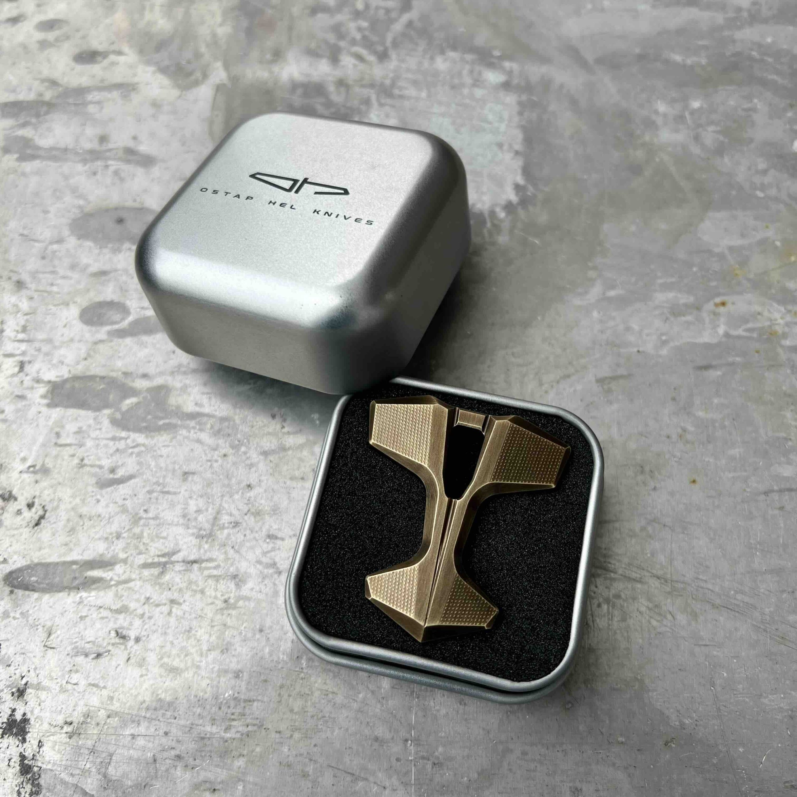 - Eleganckie pudełko aluminiowe z tłoczonym na górnym wieczku logiem Ostap Hel Knives.